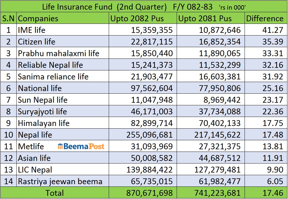 मेट लाइफको ३१ अर्ब ९ करोड ३९ लाख रुपैयाँ, सिटिजन लाइफको २२ अर्ब ८१ करोड ७१ लाख रुपैयाँ, सानिमा रिलायन्स लाइफको २१ अर्ब ९० करोड ३४ लाख रुपैयाँ, प्रभु महालक्ष्मी लाइफको १५ अर्ब ८५ करोड ४ लाख रुपैयाँ, आइएमई लाइफको १५ अर्ब ३५ करोड ९३ लाख रुपैयाँ, रिलायबल नेपाल लाइफको १५ अर्ब २४ करोड १३ लाख रुपैयाँ र सन नेपाल लाइफको ११ अर्ब ४ करोड ७९ लाख रुपैयाँ बीमाकोष कायम भएको छ।