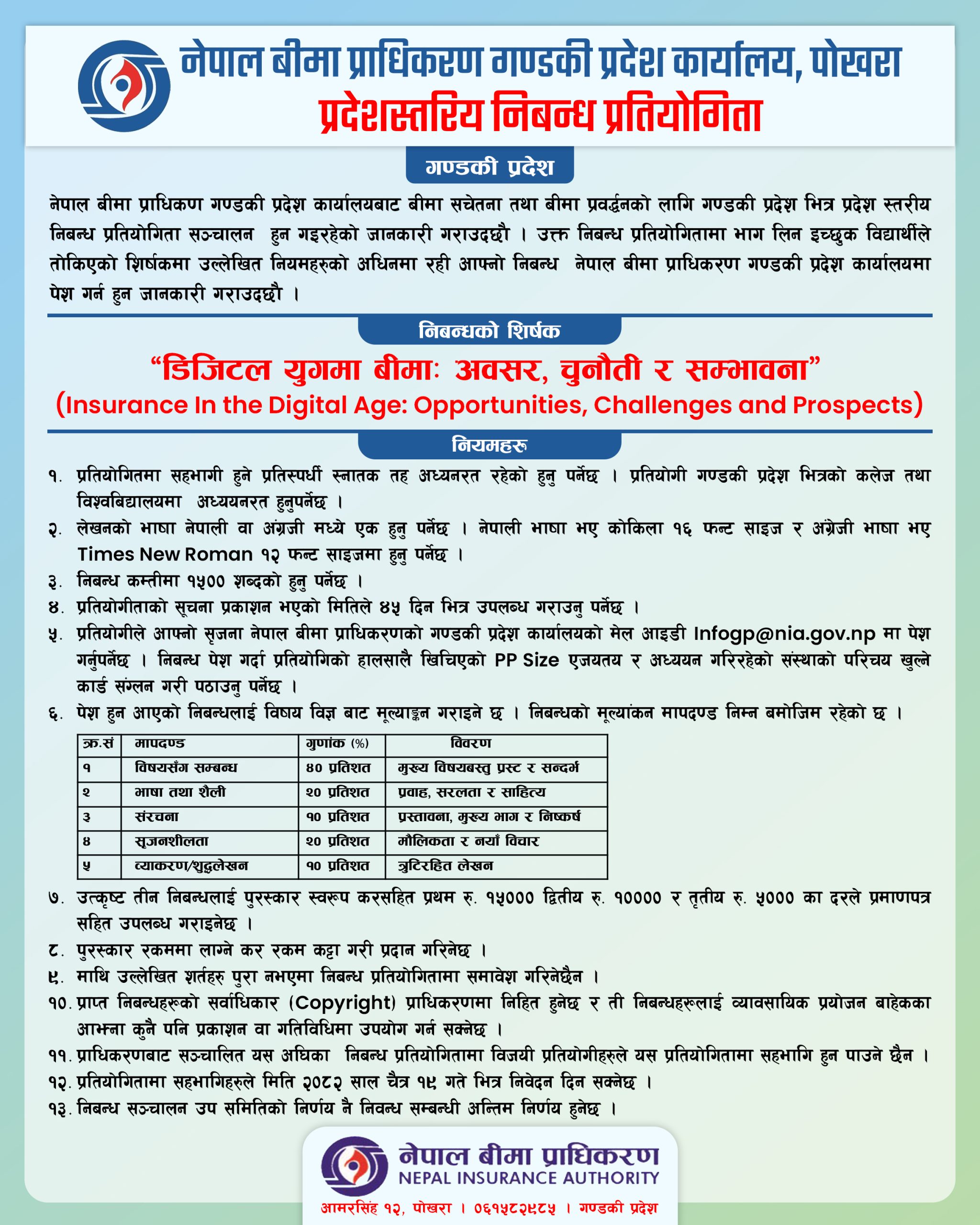 त्यसैगरी “डिजिटल युगमा बीमाः अवसर, चुनौती र सम्भावना” शीर्षकमा निबन्ध प्रतियोगिता गर्ने भएको छ। यसका लागि गण्डकी प्रदेशभित्रको विद्यालयमा स्नातक तह अध्ययनरत विद्यार्थीले सहभागिता जनाउन सक्नेछन्। निबन्ध नेपाली वा अंग्रेजीमध्ये कुनै एक भाषाबाट र कम्तीमा १५०० शब्दको हुनु पर्नेछ।