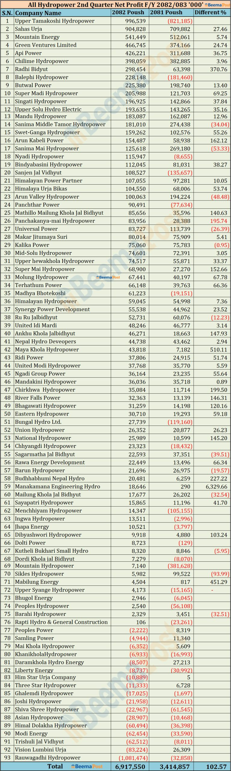 समिक्षा अवधिमा बुटवल पावरको १३.४० प्रतिशतले बढेर २२ करोड ५३ लाख, सुपर मोदीको ६९ प्रतिशतले बढेर २० करोड ५९ लाख, सिंगटी हाइड्रोको ३७ प्रतिशतले बढेर १९ करोड ६९ लाख, अप्पर सोलुको ३५ प्रतिशतले बढेर १९ करोड ३६ लाख, माण्डु हाइड्रोको १३ प्रतिशतले बढेर १८ करोड ३० लाख र सानिमा मिडिल तमोरको ३४ प्रतिशतले घटेर १८ करोड नाफा पुगेको छ ।