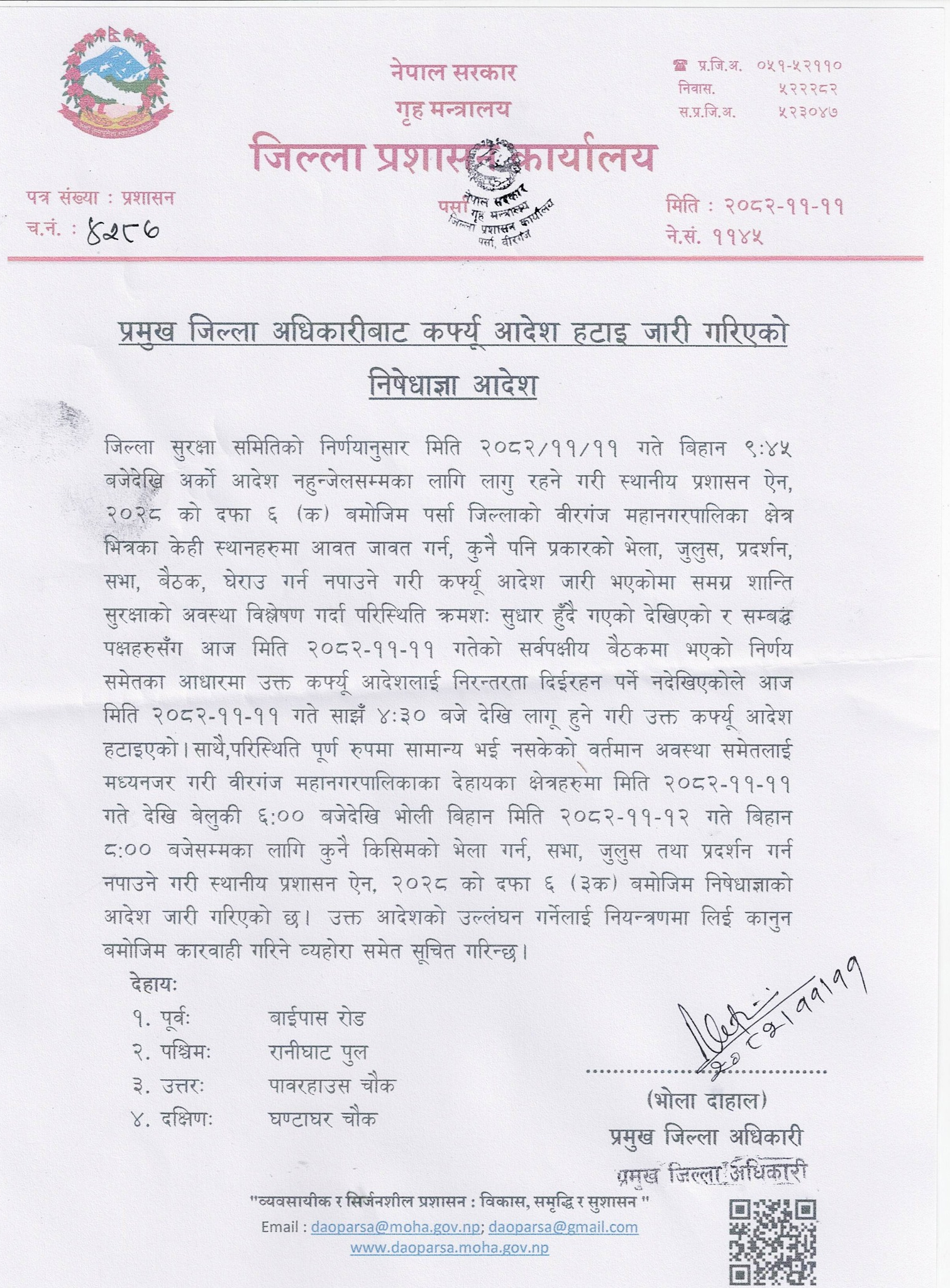 उनका अनुसार साँझ ६ बजेदेखि भोलि बिहान ८ बजेसम्मका लागि निषेधाज्ञा जारी गरिएको छ। पूर्वा बाइपास रोड, पश्चिममा रानीघाट पुल, उत्तरमा पावरहाउस चोक र दक्षिणमा घण्टाघर चोकलाई सीमा तोकिएको छ।
