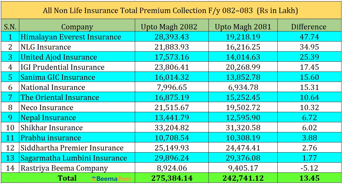 त्यस्तै सगरमाथा लुम्बिनी इन्स्योरेन्सले दुई अर्ब ९८ करोड ९६ लाख रुपैयाँ, हिमालयन एभरेष्ट इन्स्योरेन्सले दुई अर्ब ८३ करोड ९३ लाख रुपैयाँ, सिद्धार्थ प्रिमियर इन्स्योरेन्सले दुई अर्ब ५१ करोड ४९ लाख रुपैयाँ, आइजिआई प्रुडेन्सियल इन्स्योरेन्सले दुई अर्ब ३८ करोड ६ लाख रुपैयाँ र एनएलजी इन्स्योरेन्सले दुई अर्ब १८ करोड रुपैयाँ बराबरको कुल बीमा शुल्क आर्जन गरेको छ ।