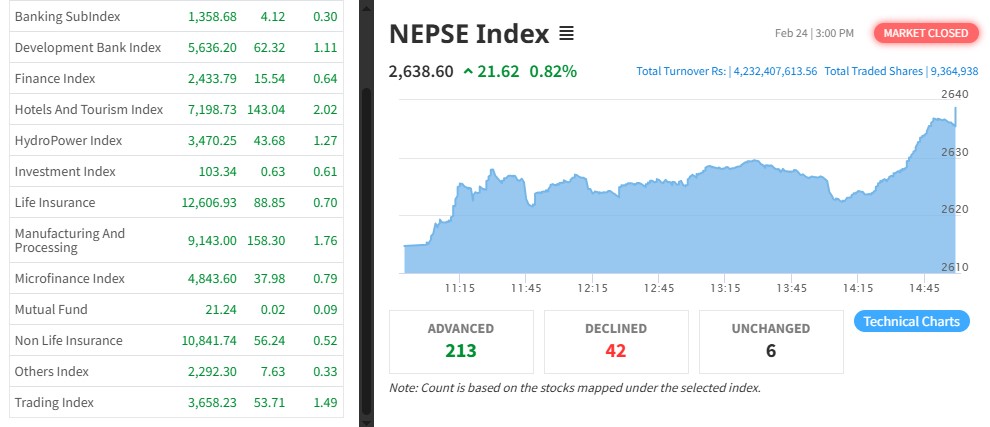 नेपाल स्टक एक्सचेञ्ज (नेप्से) २१.६२ अकंले बढेर २६३८.६० बिन्दुमा कायम भएको छ । आज३२८ कम्पनीको ९३ लाख ६४ हजार कित्ता शेयर किनबेच हुँदा ४ अर्ब २३ करोढ २४ लाख रुपैयाँको शेयर कारोबार भएको हो ।