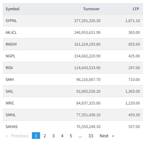 त्यस्तै, आँखु खोला, राद्यी विधुत्, नाग्दी गुप्र पावर, रिदि पावर, सुपर माई, श्रीनगर एग्रीटेक, नेपाल पुनर्बीमा, सुपर मादी र साहस उर्जाको सर्वाधिक कारोबार भएको छ ।