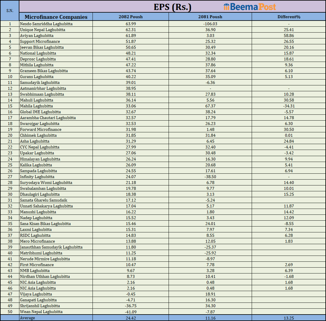 यता, प्रतिशेयर आम्दानी मिथिला लघुवित्तको ४७.२२ रुपैयाँ, ग्रामिण विकास लघुवित्तको ४३.७४ रुपैयाँ, गुरास लघुवित्तको ४०.२२ रुपैयाँ, सामुदायिक लघुवित्तको ३९.०१ रुपैयाँ, आत्मनिर्भर लुघवित्तको ३८.९५ रुपैयाँ, स्वाभिमान लघुवित्तको ३८.११ रुपैयाँ, माहुली लघुवित्तको ३६.१४ रुपैयाँ र महिला लघुवित्तको ३३.०६ रुपैयाँ रहेको छ ।