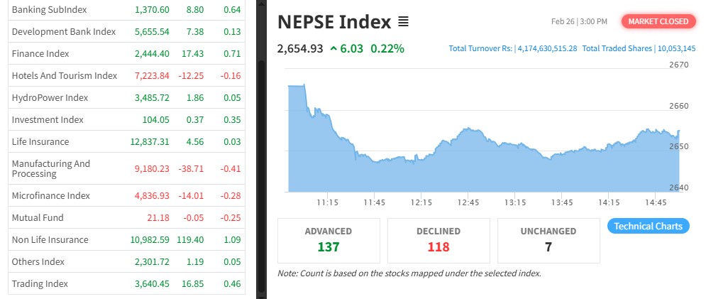 नेपाल स्टक एक्सचेञ्ज (नेप्से) ६.०३ अकंले बढेर २६५४.९३ बिन्दुमा कायम भएको छ । आज३३५ कम्पनीको १ करोड ५३ हजार कित्ता शेयर किनबेच हुँदा ४ अर्ब १७ करोड ४६ लाख ३० हजार रुपैयाँको कारोबार भएको हो ।