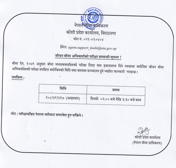 नेपाल बीमा प्राधिकरण कोशी प्रदेशले आइतबार अभिकर्ता परीक्षा सञ्चालन गर्ने