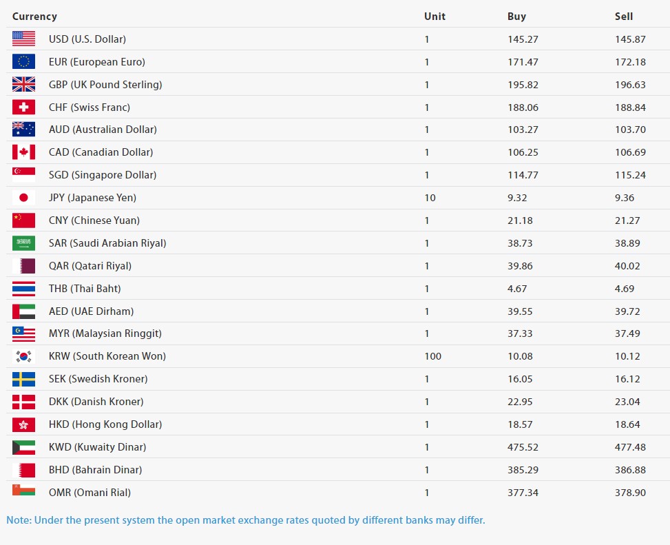 त्यसैगरी एक कतारी रियालको खरीदमूल्य ३९.८६ रुपैयाँ र बिक्रीमूल्य ४०.०२ रुपैयाँ, एक यूएई दिरामको खरीदमूल्य ३९.५५ रुपैयाँ र बिक्रीमूल्य ३९.७२ रुपैयाँ, एक मलेसियन रिंगिटको खरीदमूल्य ३७.३३ रुपैयाँ र बिक्रीमूल्य ३७.४९ रुपैयाँ र १०० दक्षिण कोरियन वोनको खरीदमूल्य १०.०८ रुपैयाँ र बिक्रीमूल्य १०.१२ रुपैयाँ कायम भएको छ।