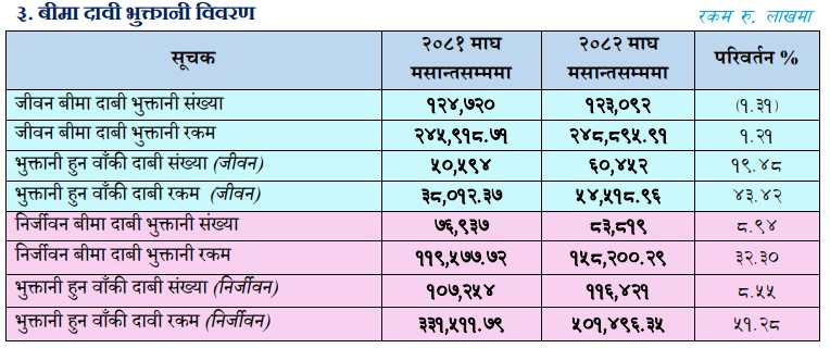 समीक्षा अवधिमा निर्जीवन बीमा कम्पनीहरुको दावी दावी बक्यौता रकम ठूलो मात्रामा बृद्धि भएको छ । गत आर्थिक वर्षको माघ महिनाको तुलनामा निर्जीवन बीमा कम्पनीहरुको दावी बक्यौता रकम ५१.२८ प्रतिशतले बृद्धि भएको छ । चालु आर्थिक वर्षको माघ मसान्तसम्मको अवधिमा निर्जीवन बीमा कम्पनीहरुको दावी बक्यौता रकम ५० अर्ब १४ करोड ९६ लाख रुपैयाँ रहेको छ ।