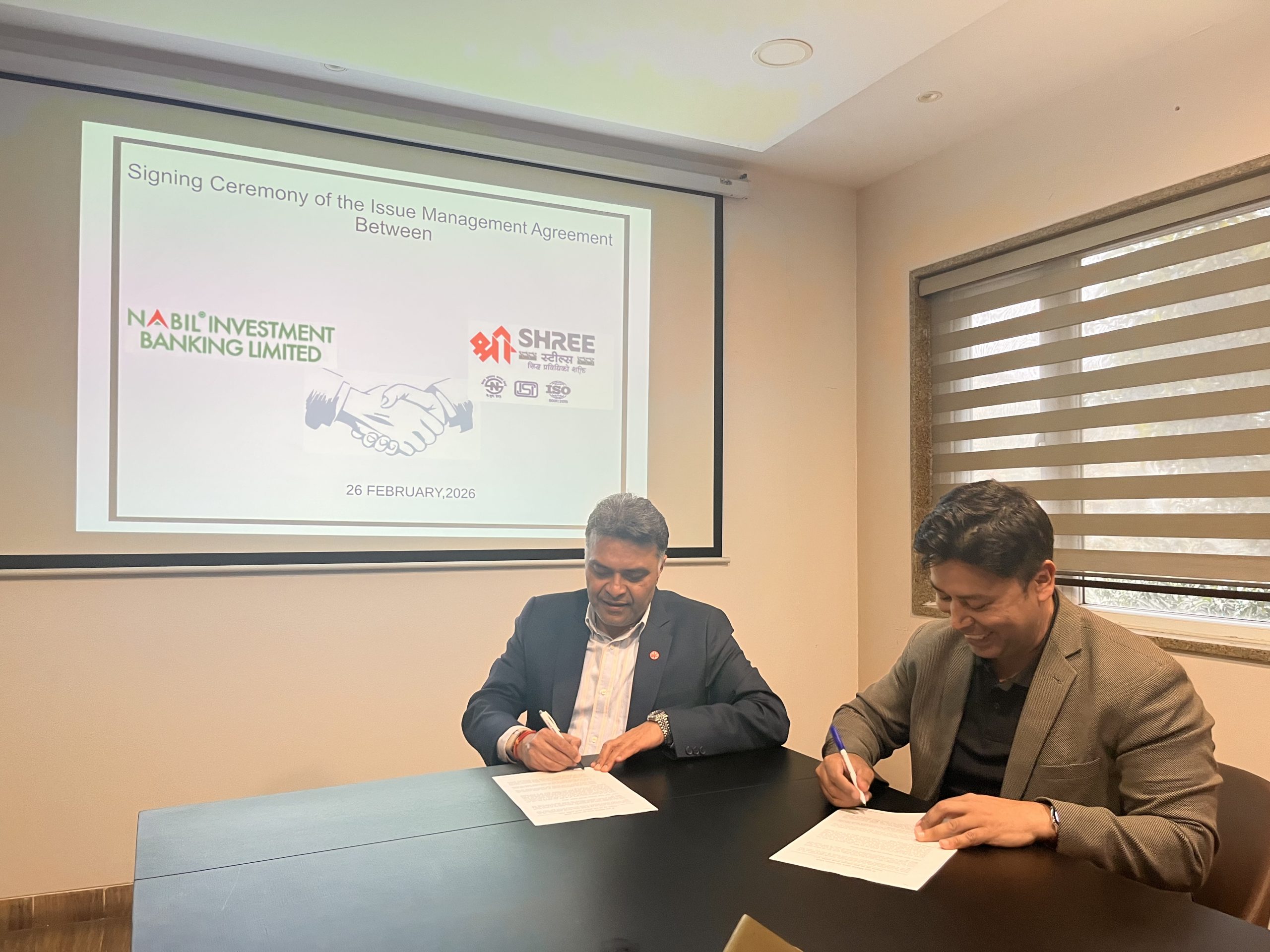 आज भएको सो सम्झौतामा श्री स्टील्स लिमिटेडको तर्फबाट कम्पनीका प्रबन्ध संचालक राजेश कुमार अग्रवाल तथा नबिल इन्भेष्टमेन्ट बैंकिङ्ग लिमिटेडका तर्फबाट कम्पनीका प्रमुख कार्यकारी अधिकृत मनिष नारायण जोशीले हस्ताक्षर गरे । निष्काशन कम्पनीका प्रमुख कार्यकारी अधिकृत सोमेश अग्रवालको रोहवरमा सम्झौता पत्रमा हस्ताक्षर सम्पन्न गरियको कम्पनीले जनाएको छ ।