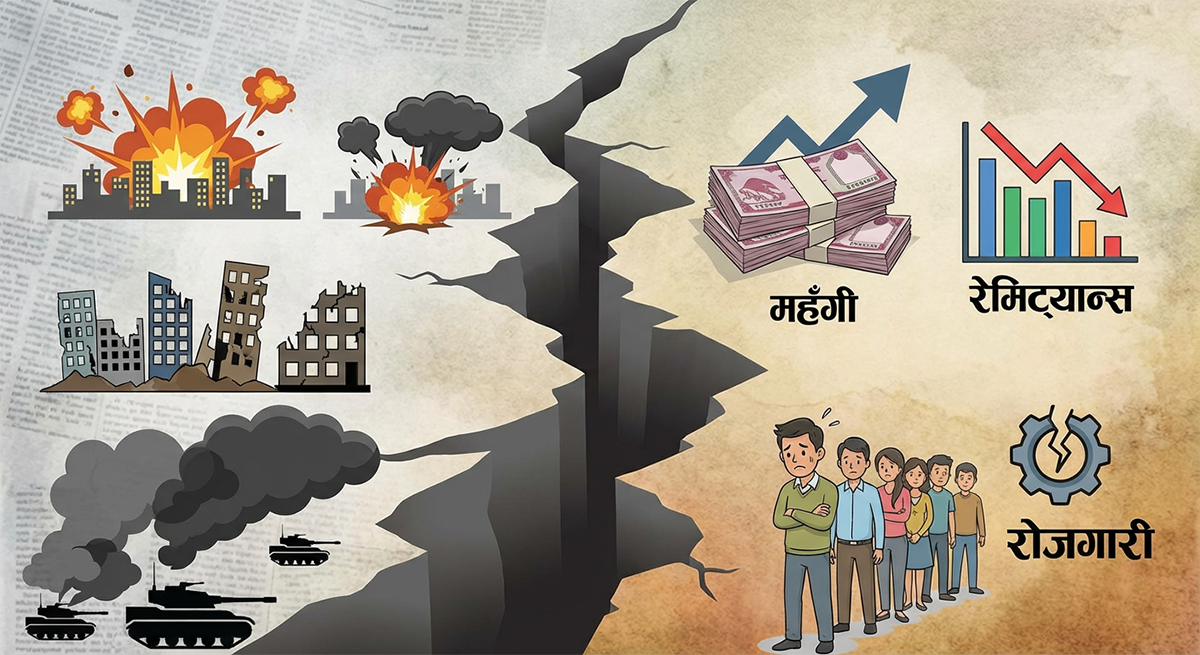 नेपालको अर्थतन्त्र संरचनागत रूपमा आयातमुखी र वैदेशिक रोजगारीमा आधारित छ । यस्तो अवस्थामा मध्यपूर्वमा चर्किएको युद्धले नेपाली श्रमिक, रेमिट्यान्स, आयात–निर्यात, विदेशी मुद्रा सञ्चिति, मुद्रास्फीति, राजस्व संकलन, बैंकिङ प्रणालीदेखि समग्र आर्थिक स्थिरतासम्म व्यापक दबाब सिर्जना गर्ने देखिन्छ । यसअघि रुस र युक्रेनबीचको युद्धले इन्धन, खाद्यान्न र ढुवानी लागत बढाएर नेपालमा महँगी चुल्याएको अनुभव अझै ताजै छ । त्यसको प्रभाव पूर्ण रूपमा साम्य नहुँदै मध्यपूर्वमा अर्को ठूलो द्वन्द्व सुरु हुनु नेपालका लागि थप चिन्ताको विषय बनेको छ ।