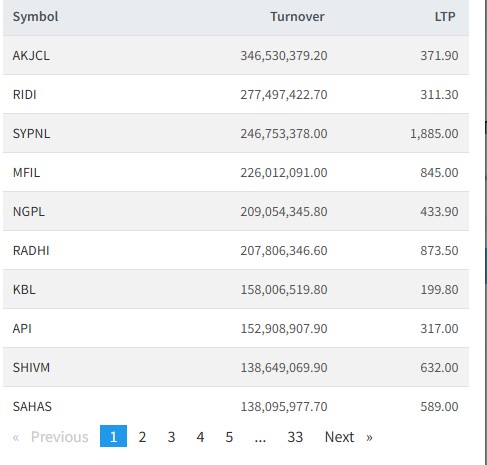 त्यस्तै, रिदि पावर, एसवाई प्यानल, मञ्जुश्री फाइनान्स, नाग्दी गुप्र, रादी विधुत्, कुमारी बैंक, अपी पावर, शिवम् सिमेन्टस र साहस उर्जाको सर्वाधिक कारोबार भएको छ।