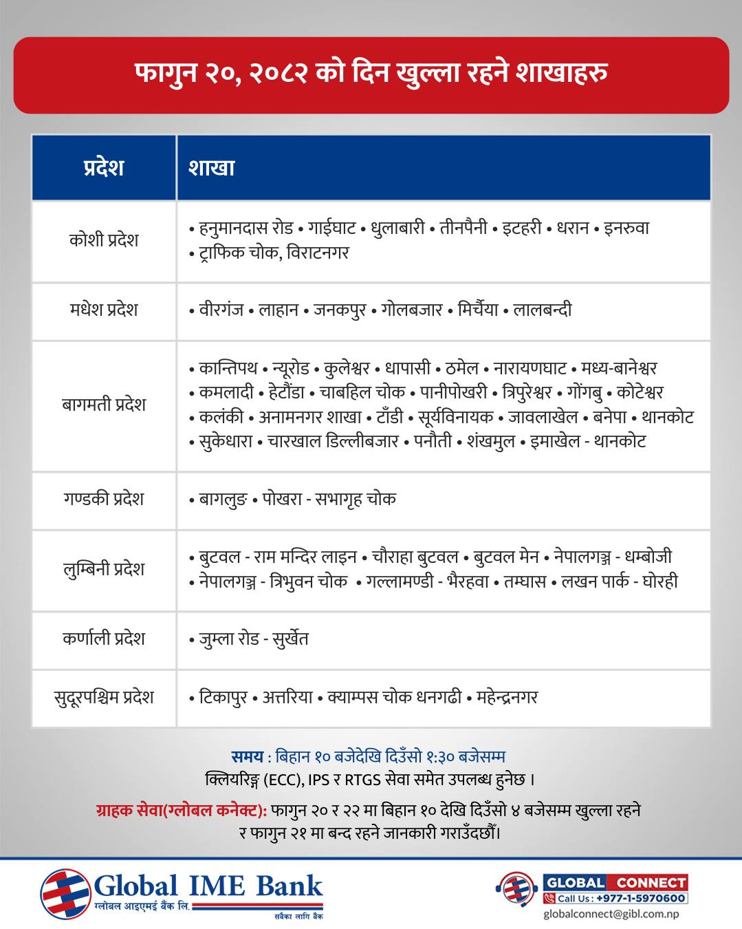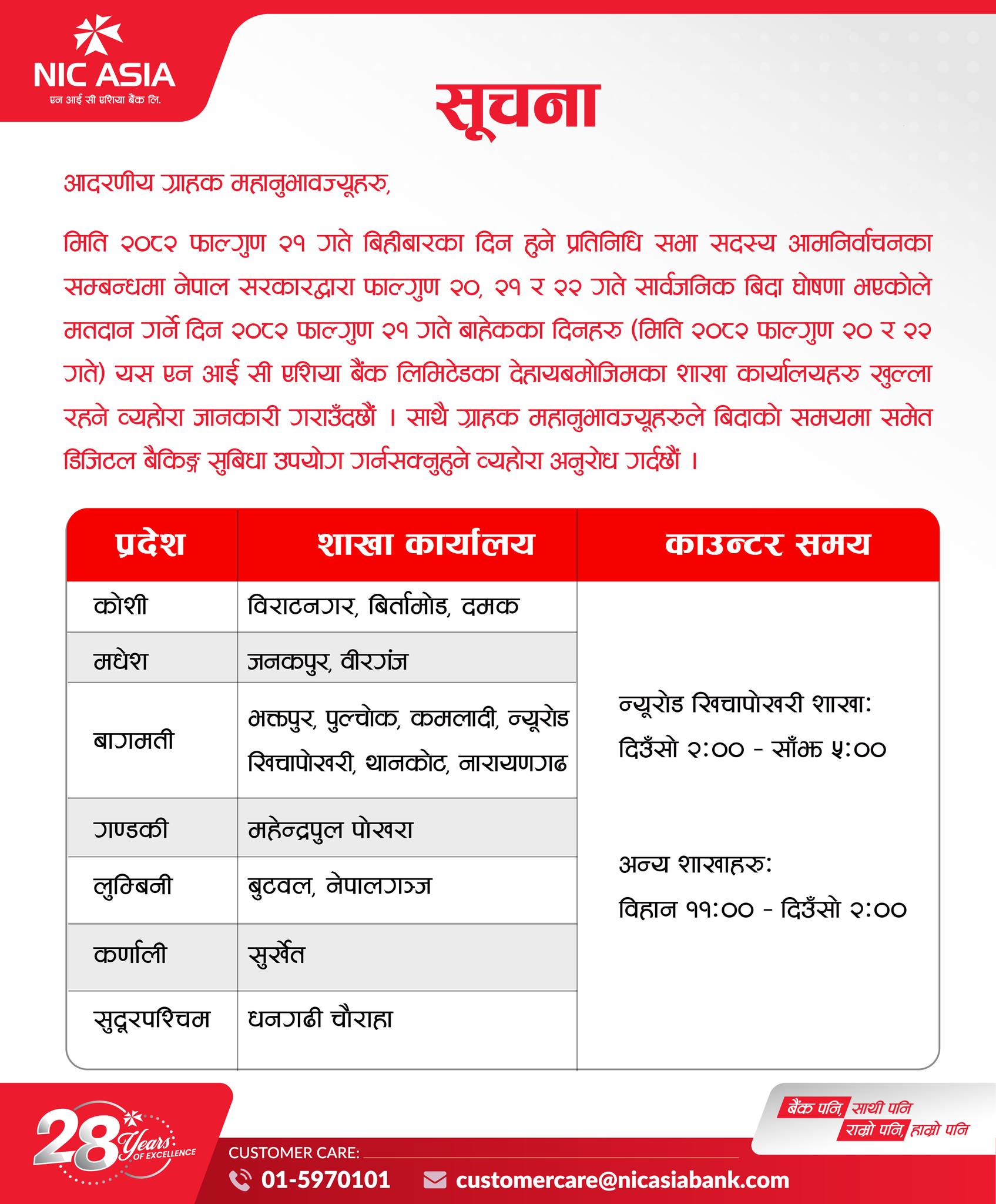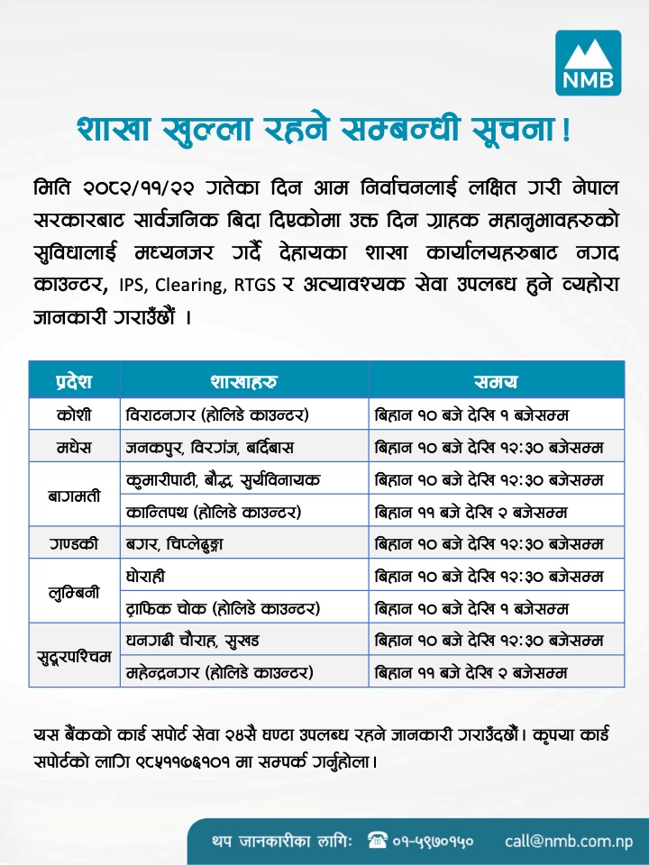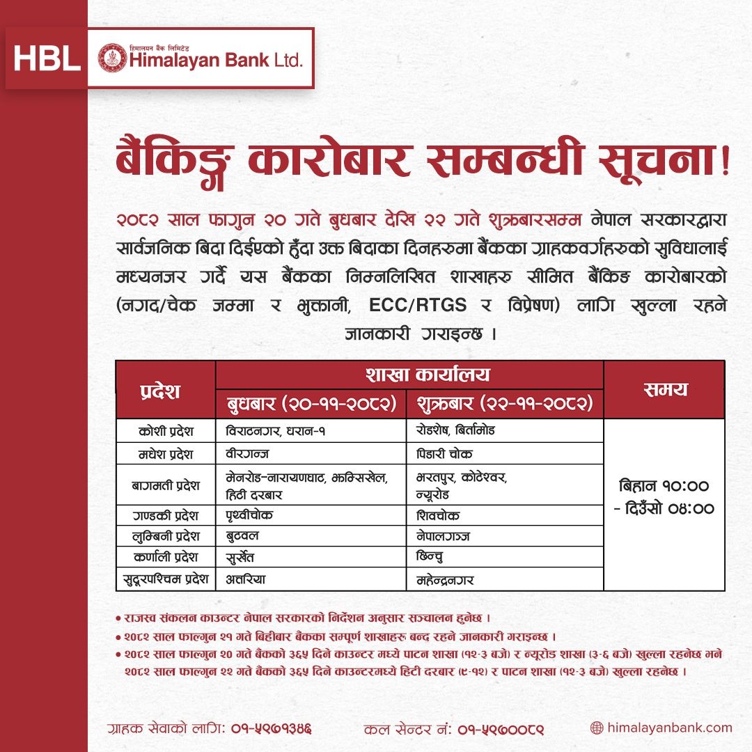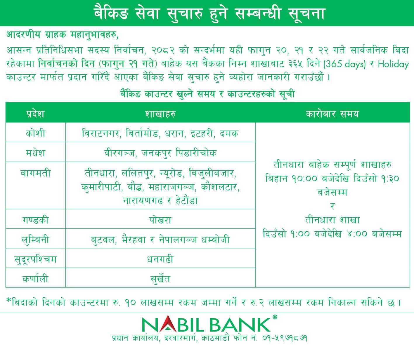 नेपाल राष्ट्र बैंकबाट अनुमति प्राप्त वाणिज्य तथा विकास बैंकहरुले सरकारले फागुन २०, २१ र २२ गते घोषणा गरेको सार्वजनिक विदाको सन्दर्भमा २१ गते मतदान भएकाले यस दिन बाहेक अन्य २० र २२ गते बैंकिङ्ग सेवा उपलब्ध गराउने भएका छन् । बैंकहरुले शाखा कार्यालयबाट नगद काउन्टर, आइपीएस, क्लियरीङ र अत्यावश्यक सेवा उपलब्ध गराउने भएका छन् । साथै बैंकहरुले आफ्ना ग्राहकहरुलाई भ्याएसम्म डिजिटल कारोबार गर्न अनुरोध गरेको छ ।