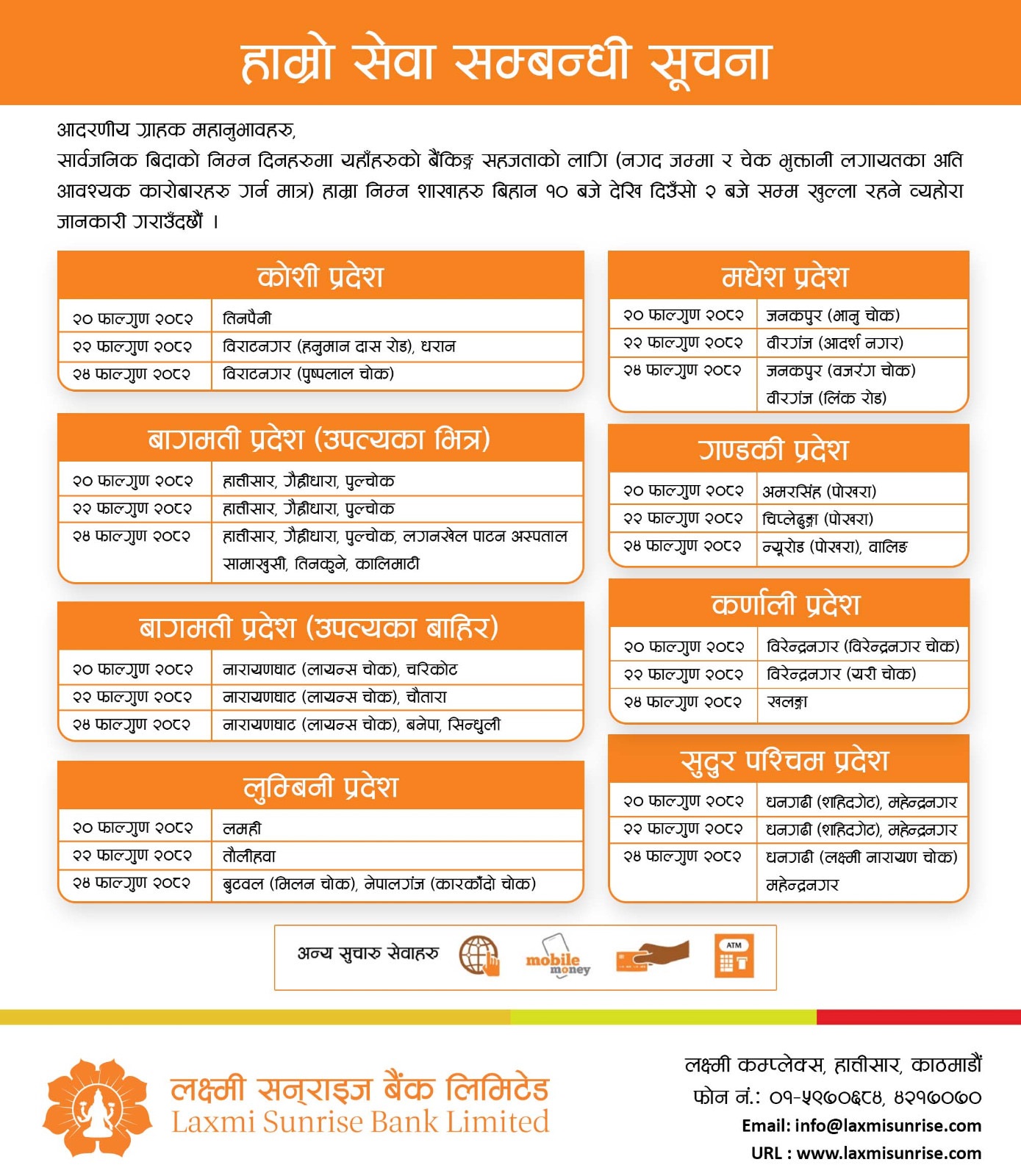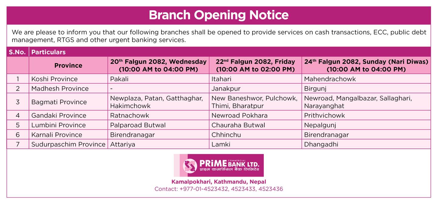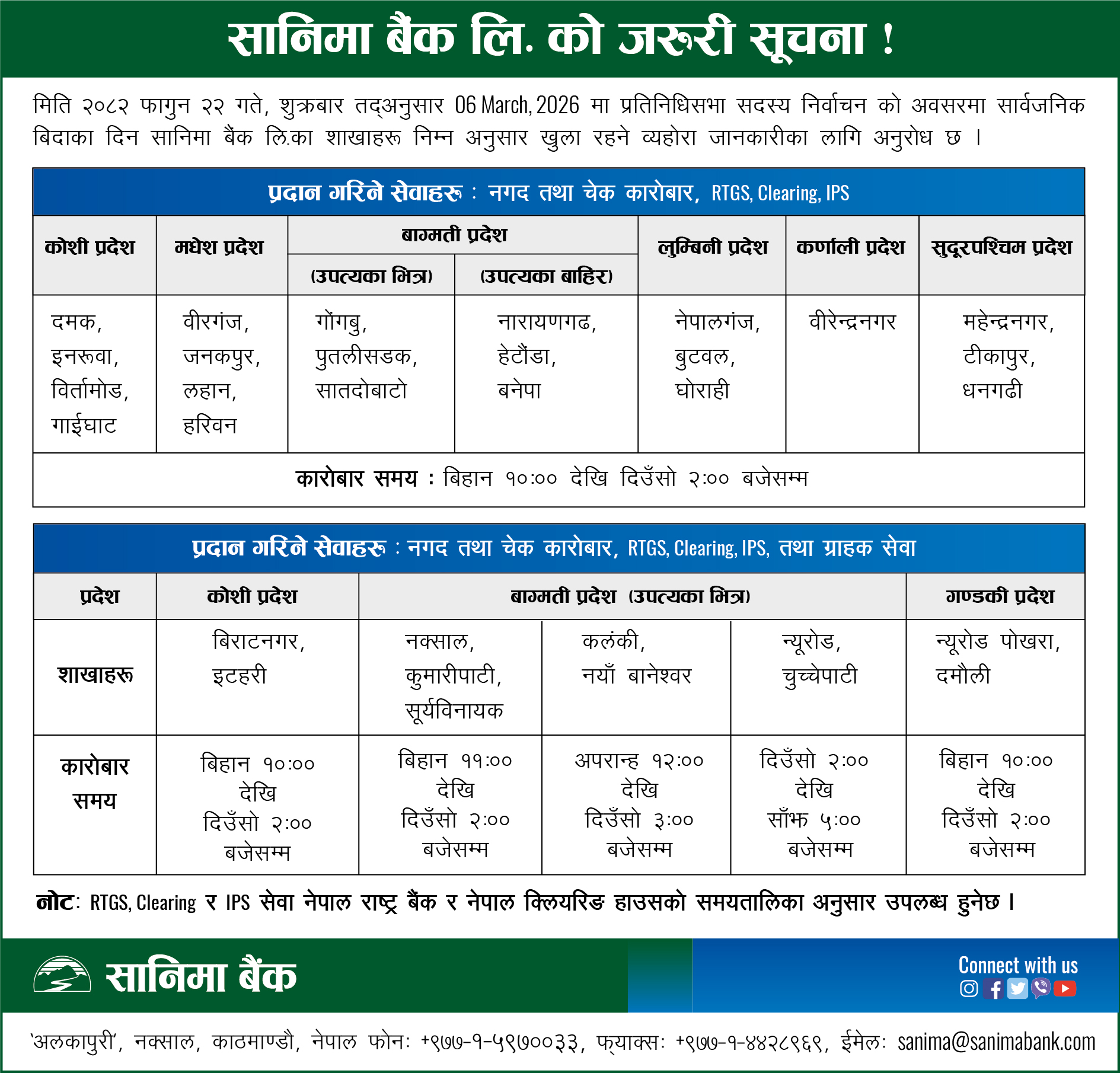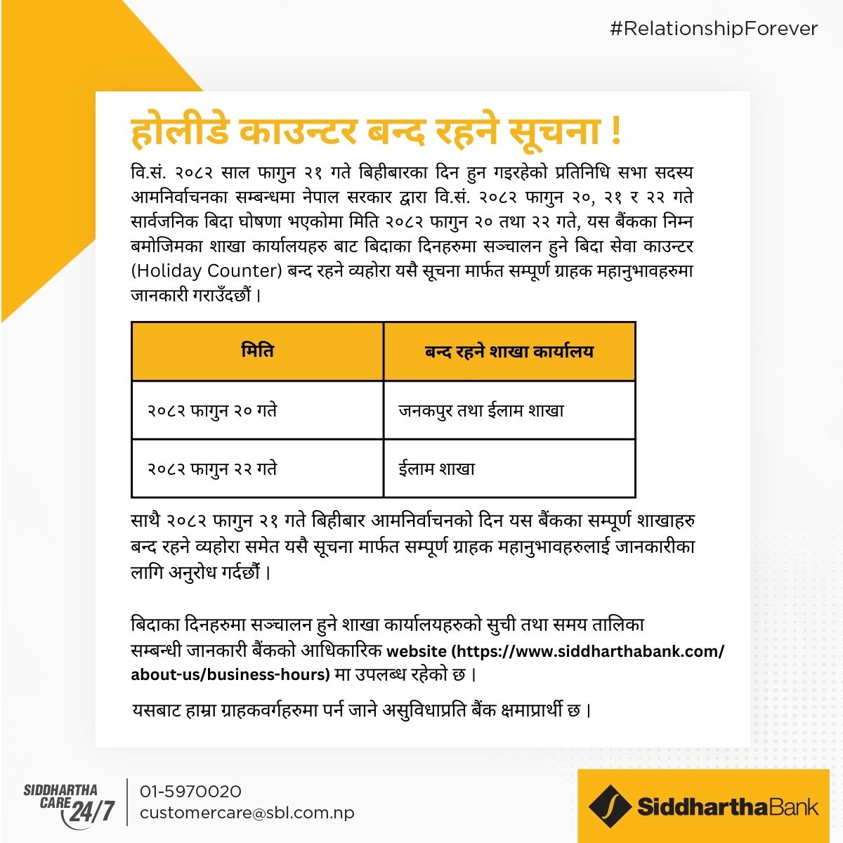 नेपाल राष्ट्र बैंकबाट अनुमति प्राप्त वाणिज्य तथा विकास बैंकहरुले सरकारले फागुन २०, २१ र २२ गते घोषणा गरेको सार्वजनिक विदाको सन्दर्भमा २१ गते मतदान भएकाले यस दिन बाहेक अन्य २० र २२ गते बैंकिङ्ग सेवा उपलब्ध गराउने भएका छन् । बैंकहरुले शाखा कार्यालयबाट नगद काउन्टर, आइपीएस, क्लियरीङ र अत्यावश्यक सेवा उपलब्ध गराउने भएका छन् । साथै बैंकहरुले आफ्ना ग्राहकहरुलाई भ्याएसम्म डिजिटल कारोबार गर्न अनुरोध गरेको छ ।