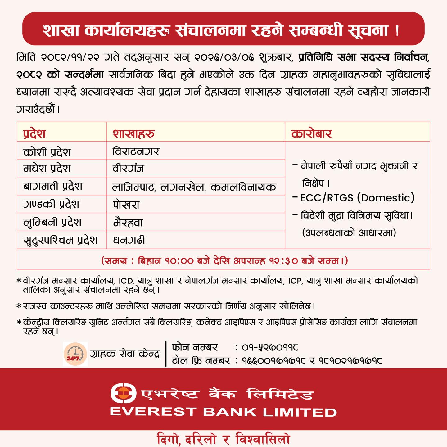 निर्वाचन आयोगको अनुरोधमा केन्द्रीय बैंकले जारी गरेको सूचना अनुसार, फागुन २१ गते मुलुकभरका मतदाताले मतदान गर्ने दिन बाहेकका अन्य घोषित सार्वजनिक बिदाका दिनहरूमा निश्चित बैंकिङ सेवाहरू उपलब्ध हुनेछन् । साथै, निर्वाचन प्रचारप्रसारका लागि बैंक खाता सञ्चालन गर्ने राजनीतिक दल तथा उम्मेदवारहरूका लागि नगद वा चेक जम्मा गर्ने तथा भुक्तानी दिने लगायतका आवश्यक बैंकिङ सेवाहरू प्रदान गर्नुपर्ने केन्द्रीय बैंकले जनाएको छ ।
