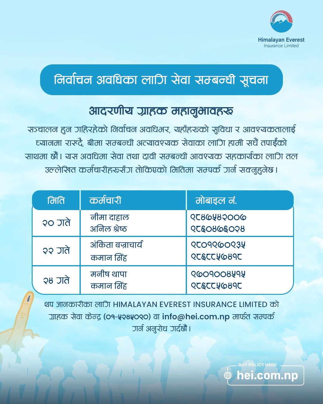 काठमाडौं । देश निर्वाचनमा व्यस्त रहेको छ । सरकारले फागुन २० देखि २२ गतेसम्म निर्वाचन प्रयोजनको लागि सार्वजनिक बिदा दिएको छ । देशमा सञ्चालित निर्जीवन बीमा कम्पनीहरुले निर्वाचन बिदामा पनि बीमा सेवा उपलब्ध गराउने भएका छन् ।