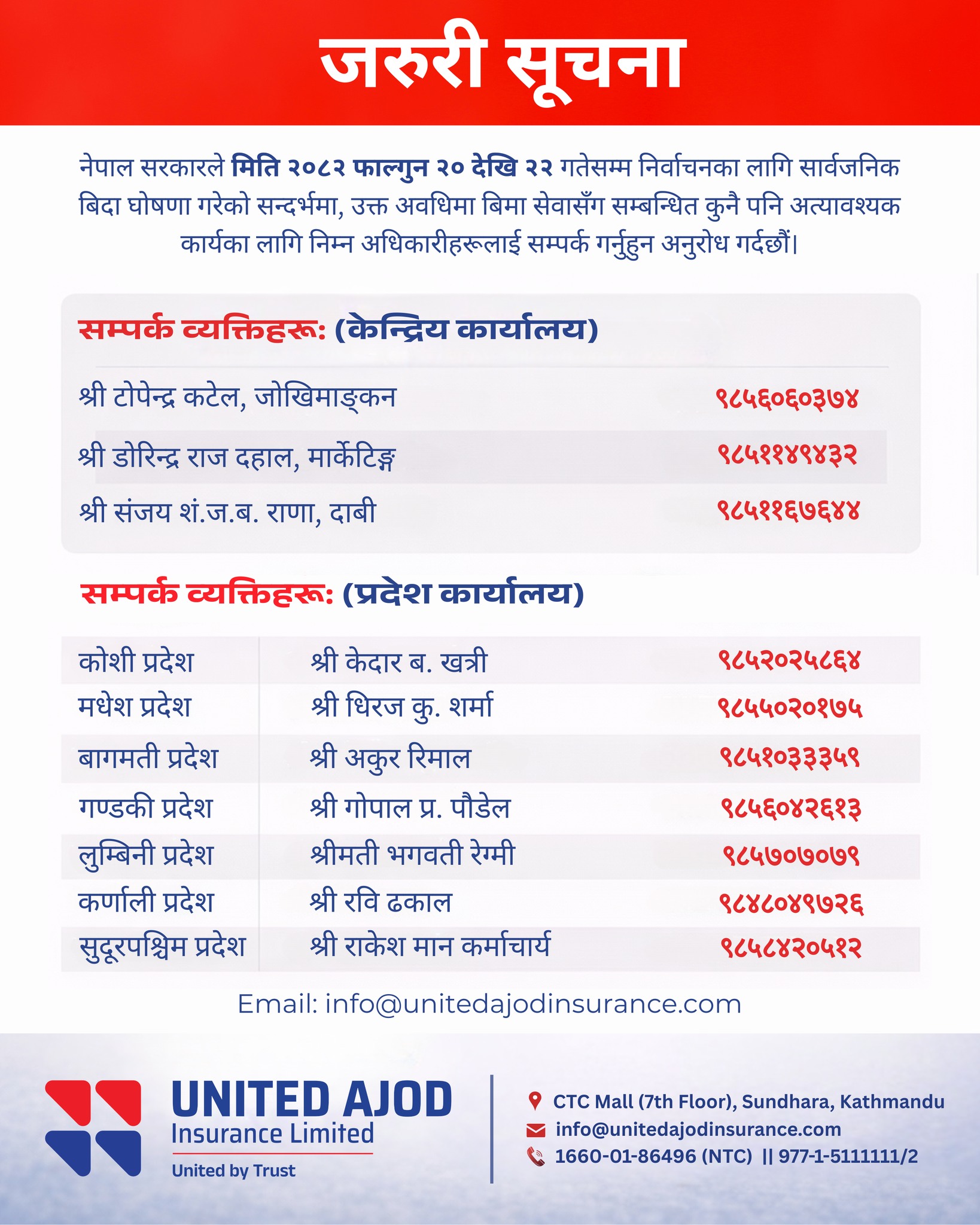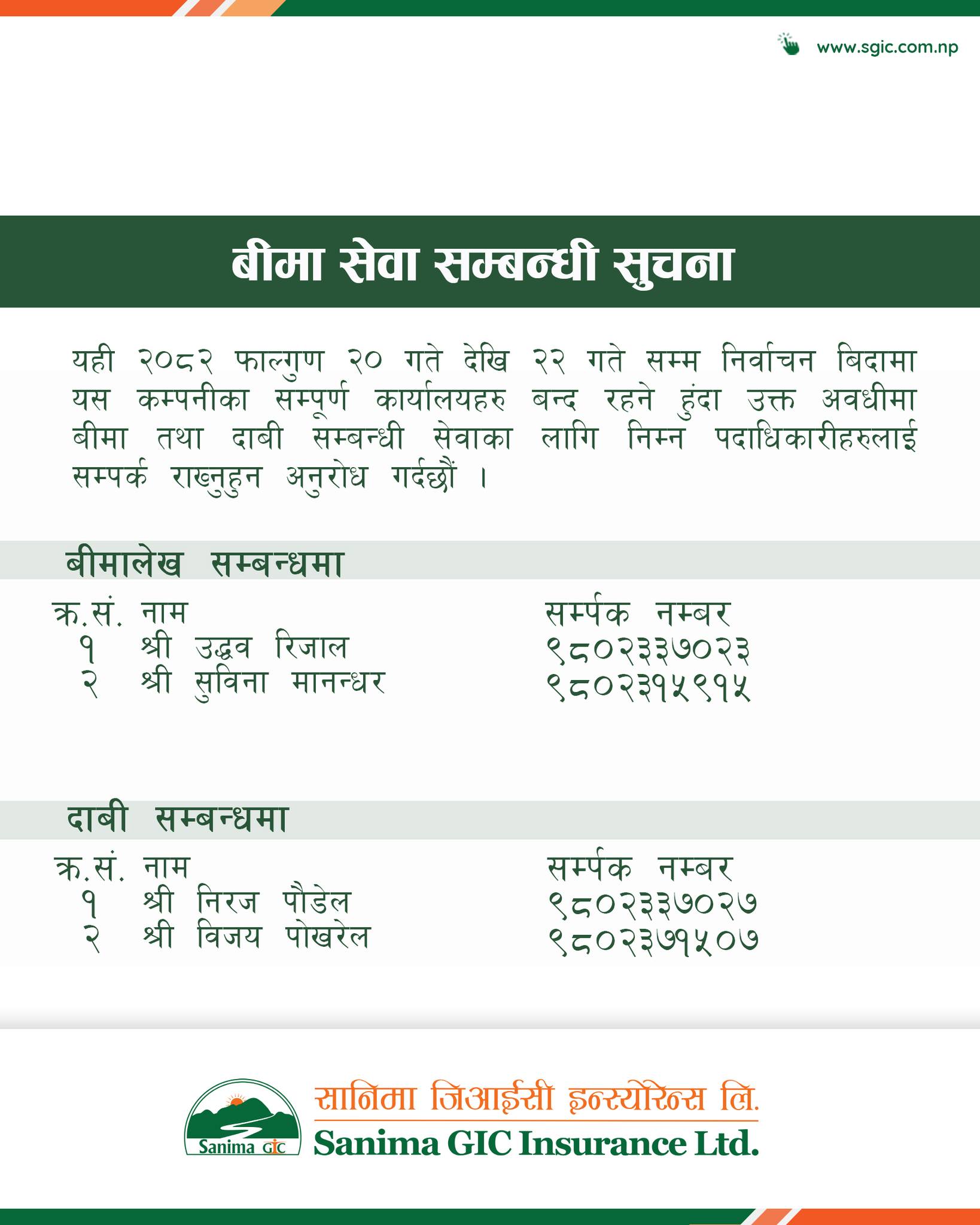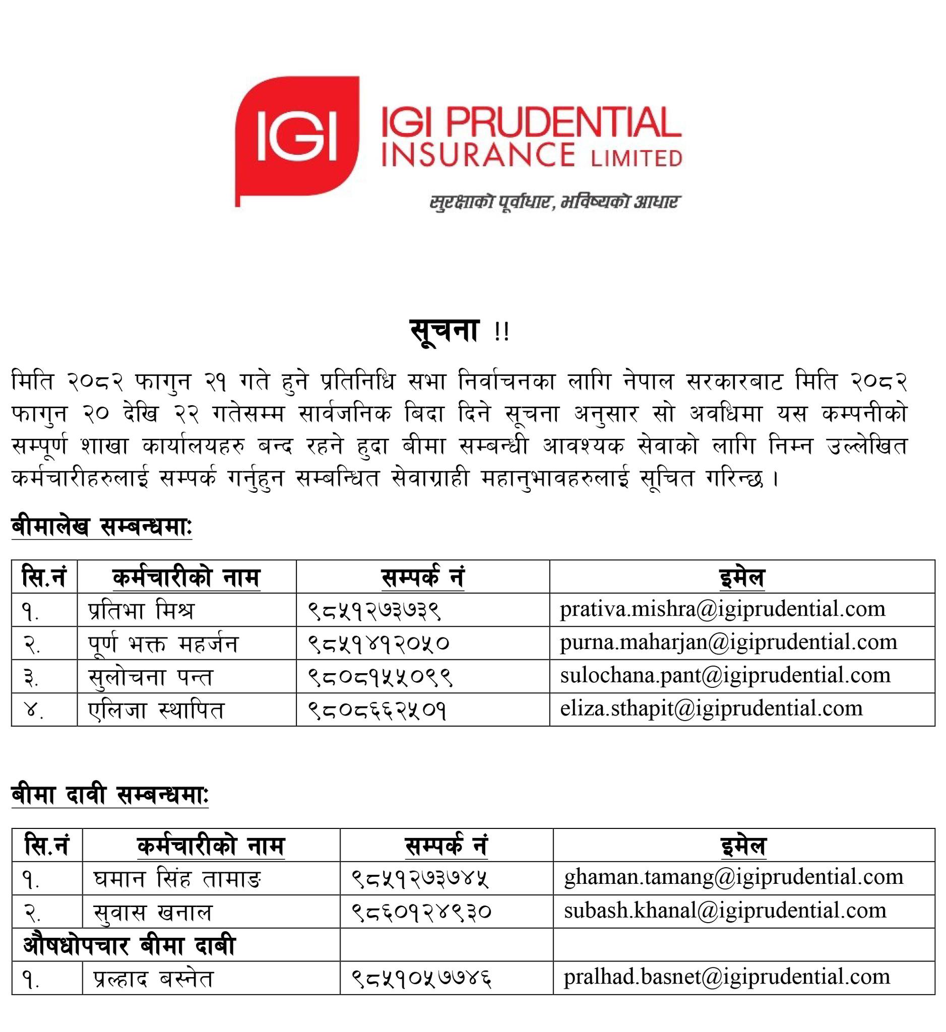 यी चार निर्जीवन बीमा कम्पनीहरुले निर्वाचन बिदामा समेत सेवा उपलब्ध गराउने (सूचनासहित)