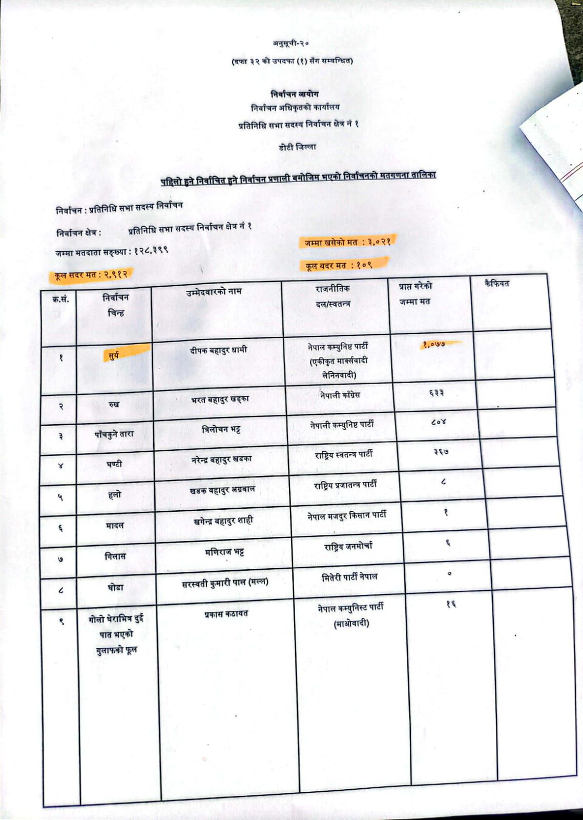 मतगणनाको प्रारम्भिक विवरण अनुसार दीपक बहादुर धामी (नेपाल कम्युनिष्ट पार्टी (एकीकृत मार्क्सवादी लेनिनवादी)) ले १ हजार ७७ मत प्राप्त गरेका छन्।