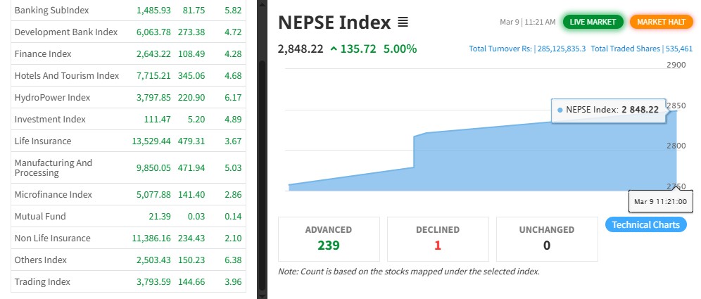 नेप्से परिसूचक कारोबार सुरु भएको १ मिनेट मै ४ प्रतिशतले बढेर २० मिनेटको लागि सर्किट ब्रेक लागेको थियो । बजार पुनः ५ प्रतिशतले बढेर ४० मिनेटका लागि कारोबारमा ब्रेक लागेको हो । बजार १३५ अंकले बढेर २८४८.२२ बिन्दुमा कायम भई ब्रेक लागेको छ ।