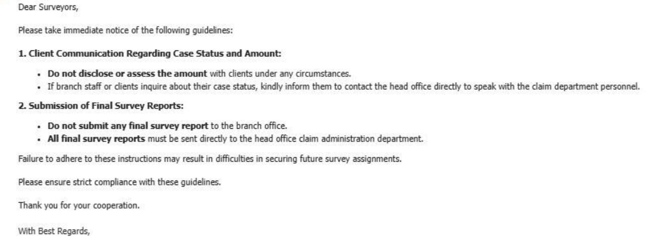 सो कम्पनीका तत्कालिन दावी विभागका प्रमुख सुनिल पोखरेलले बीमा सर्भेयरहरुलाई इमेलमार्फत सो चार बुँदे निर्देशन दिइएको थियो । अहिले पोखरेल दावी विभागबाट सामान्य प्रशासन विभागमा सरुवा भइसकेका छन् ।