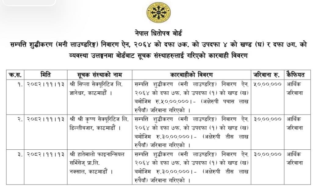 बोर्डले तीन वटै ब्रोकर कम्पनीलाई सम्पत्ति शुद्धीकरण (मनी लाउण्डरिङ्ग) निवारण ऐन, २०६४ को दफा ७फ को उपदफा (१) को खण्ड (ख) बमोजिम ५० लाख रुपैयाँ जरिवाना तिराएको हो। उक्त खण्डमा ‘यो ऐन वा यस ऐन अन्तर्गत बनेको नियम वा जारी गरेको निर्देशिका वा दिएको आदेश वा निर्देशनको उल्लंघन गरेमा सोको गाम्भीर्यका आधारमा’ जरिवाना गर्न सक्ने व्यवस्था रहेको छ।