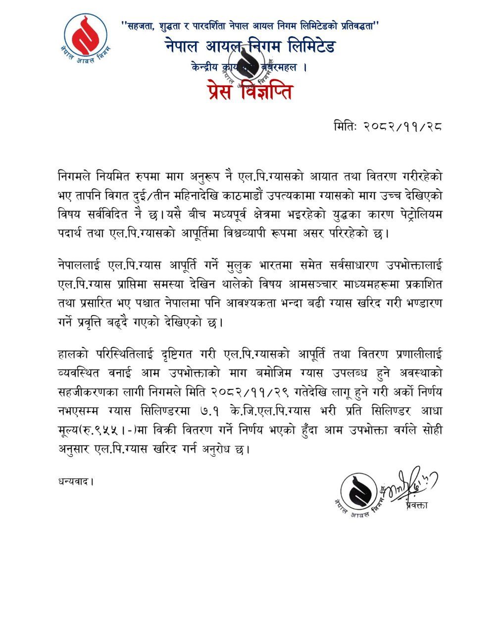 आधा सिलिन्डर ग्यासको मूल्य पनि पुरानो पूर्ण सिलिन्डरको आधा मात्र तोकिएको छ। अन्तर्राष्ट्रिय स्तरमा जारी युद्ध र आपूर्ति चुनौतीका कारण बजारमा ग्यासको माग बढेपछि निगमले यो कदम चाल्नुपरेको हो।