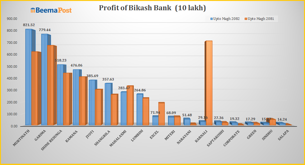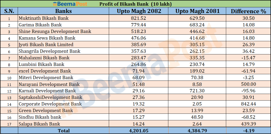 ७ महिनामा विकास बैंकको नाफा ४ अर्ब २० करोडः अग्रस्थानमा मुक्तिनाथ र गरिमा, १७ मध्य कुनले कति कमाए ?