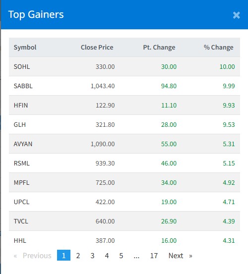 साथै, अभियान लघुवित्तको ५.३१ प्रतिशत, रिलायन्स मिल्सको ५.१५ प्रतिशत, मल्टिप्रपोज फाइनान्सको ४.९२ प्रतिशत र युनिर्भनल पावरको ४.७१ प्रतिशतले शेयर मूल्य बढेको छ ।