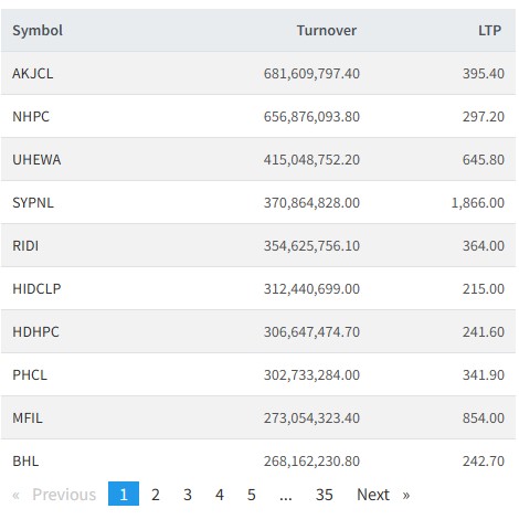 त्यस्तै, नेशनल हाईड्रोपावर, अपर होपाखोला, एसवाई प्यानल, रिदि पावर, हाईड्रोइलेक्टिसिटि इन्भेष्टमेन्ट एण्ड डेभलपमेन्ट, हिमाल दोलखा हाईड्रोपावर, पिपुल्स हाईड्रोपावर, मञ्जु श्री फाइनान्स र बलेफी हाईड्रोपावरको सर्वाधिक कारोबार भएको छ।