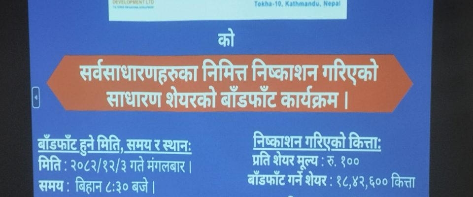 काठमाडौं । शिखर पावर डेभलपमेन्ट लिमिटेडले फागुन १७ गतेदेखि २६ गतेसम्म सर्वसाधारणका लागि बिक्री खुला गरेको आईपीओ आज चैत ३ गते बिक्री प्रबन्धक ग्लोबल आइएमई क्यापिटल लिमिटेडले बाँडफाँड गरेको छ। कम्पनीले प्रतिकित्ता १०० रुपैयाँमा कुल ३२ लाख कित्ता आईपीओ बिक्री गर्न नेपाल धितोपत्र बोर्डबाट पुस १६ गते अनुमति पाएको हो। अनुमति पाए लगत्तै माघ ६ गतेदेखि ९ गतेसम्म वैदेशिक रोजगारीमा रहेका नेपालीलाई र माघ २० गतेसम्म आयोजना प्रभावितलाई आईपीओ निष्काशन गरी बाँडफाँड समेत गरिसकेको छ। त्यसपछि कम्पनीले दोस्रो चरणमा सामूहिक लगानी कोष र कर्मचारी सहित सर्वसाधारणमा आईपीओ बिक्री खुला गरेको थियो। कम्पनीले सर्वसाधारणलाई प्रतिकित्ता १०० रुपैयाँमा कुल १८ लाख ४२ हजार ६०० कित्ता आईपीओ बिक्री गरेको हो। यसमा न्यूनतम १० कित्ता र अधिकतम १० हजार कित्तासम्म माग गर्न सकिने व्यवस्था गरिएको थियो। बिक्री अवधिभर २६ लाख ८७ हजार ३४७ जना आवेदन परेकोमा २६ लाख ५० हजार ८४७ जनाले २ करोड ८३ लाख ९४ हजार ७९० कित्ताका लागि दिएको आवेदन मात्रै स्वीकृत भएको छ। अर्थात कुल ३६ हजार ५०० जना आवेदको आवेदन नै रद्द भएको छ। यसरी मागभन्दा धेरै मात्रामा आवेदन परेकाले गोलाप्रथाद्वारा आईपीओ बाँडफाँड गरिएको छ। बाँडफाँडमा १ लाख ८४ हजार २६० जना आवेदकले १०/१० कित्ताका दरले शेयर हात पारेका छन् भने बाँकी २४ लाख ६६ हजार ५८७ जना आवेदकको … Continue reading शिखर पावरको आईपीओ बाँडफाँड, २४ लाख ६६ हजार आवेदकको हात रित्तो