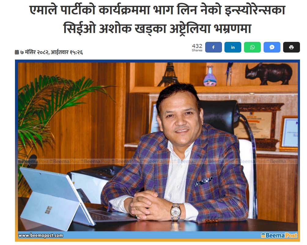 तपाईको बीमापोष्टमा ७ मंसिर २०८२ मा प्रकाशित “एमाले पार्टीको कार्यक्रममा भाग लिन नेको इन्स्योरेन्सका सिईओ अशोक खड्का अष्ट्रेलिया भ्रमणमा” र विभिन्न शिर्षकमा प्रकाशित समाचार प्रति यस कम्पनीको गम्भिर ध्यानाकर्षण भै आपत्ती रहेको छ ।