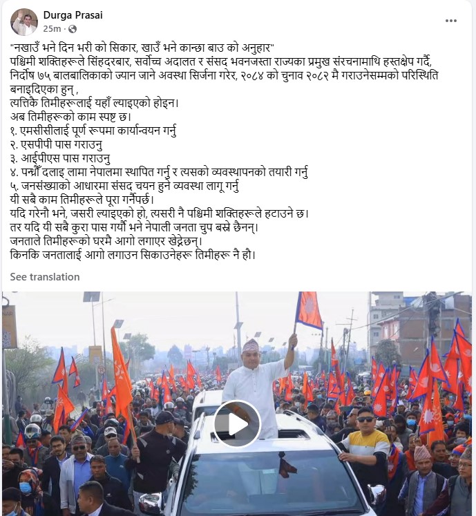 काठमाडौं । प्रधानमन्त्रीमा नियुक्त नहुँदै बालेन शाहलाई राजावादी आन्दोलनका अगुवा दुर्गा प्रसाईले कडा चेतावनी दिँदै एमसीसी खारेज गर्न र एसपीपी पास नगर्न भनेका छन् ।