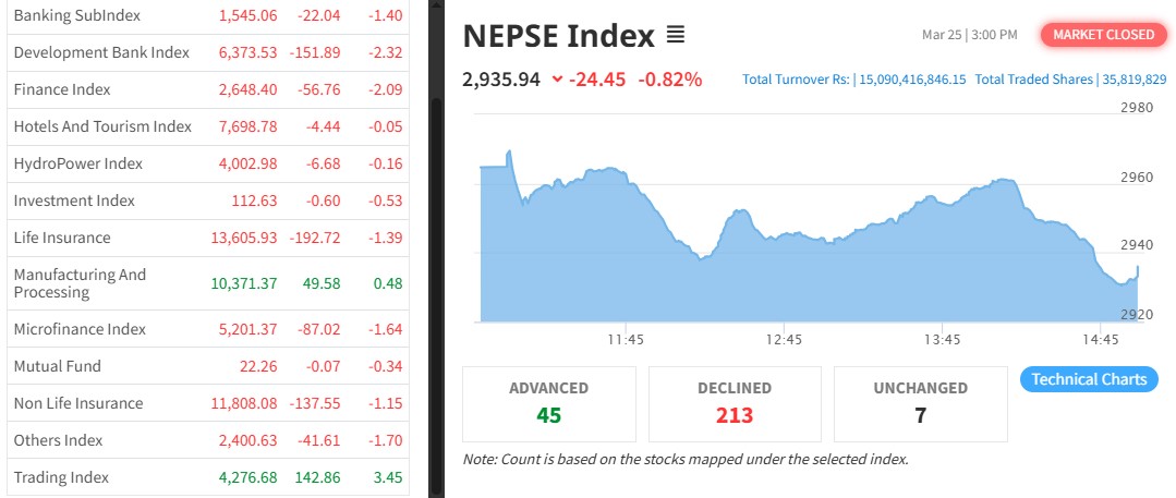 काठमाडौं । साता कारोबारको चौथो दिन अर्थात बुधबार शेयर बजारमा दोहोरो अंकको गिरावट आएको छ । आज नेप्से परिसूचक २४.४५ अंकले घटेर २९३५.९४ को बिन्दुमा कायम भएको छ ।