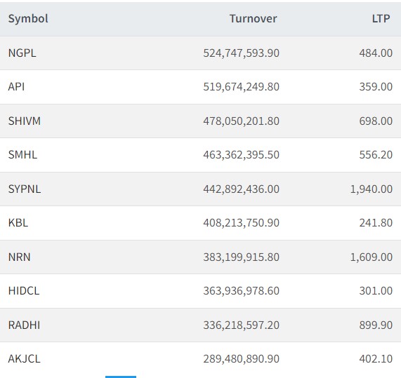 त्यस्तै अपी पावरको ५१ करोड ९६ लाख रुपैयाँ, शिवमको ४७ करोड ८० लाख रुपैयाँ, सुपर मादी हाइड्रोपावरको ४६ करोड ३३ लाख रुपैयाँ, एसवाई प्यानलको ४४ करोड २८ लाख रुपैयाँ, कुमारी बैंकको ४० करोड ८२ लाख रुपैयाँ, एनआरएनको ३८ करोड ३२ लाख रुपैयाँ, एचआईडीसीएलको ३६ करोड ३९ लाख रुपैयाँ, राधीको ३३ करोड ६२ लाख रुपैयाँ र आँखुखोला जलविद्युतको २८ करोड ९४ लाख रुपैयाँभन्दा बढीको शेयर कारोबार भएको छ।