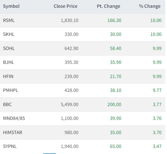 त्यसैगरी सोलु हाइड्रोपावर, भुजुङ्ग हाइड्रोपावर र होटल फरेष्ट इनको शेयरमूल्य ९.९९ प्रतिशतले वृद्धि भएको छ भने पञ्चकन्या माई हाइड्रोपावरको ९.७७ प्रतिशतले वृद्धि भएको छ।