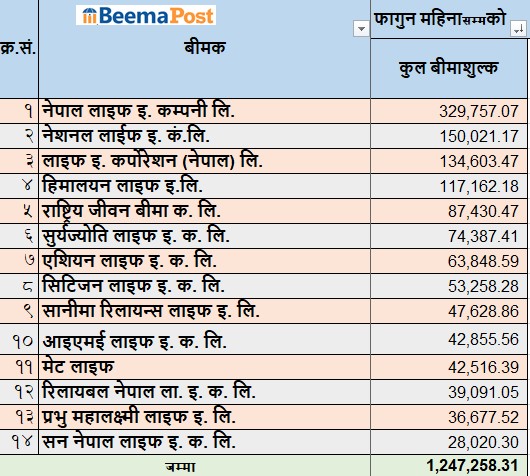 सानिमा रिलायन्स लाइफको ४ अर्ब ७६ करोड रुपैयाँ, आइएमई लाइफले ४ अर्ब २८ करोड रुपैयाँ, मेट लाइफले ४ अर्ब २५ करोड रुपैयाँ, रिलायबल नेपाल लाइफले ३ अर्ब ९० करोड रुपैयाँ, प्रभु महालक्ष्मी लाइफले ३ अर्ब ६६ करोड रुपैयाँ र सन नेपाल लाइफले २ अर्ब ८० करोड रुपैयाँ कुल बीमाशुल्क आर्जन गर्न सफल भएका छन् ।