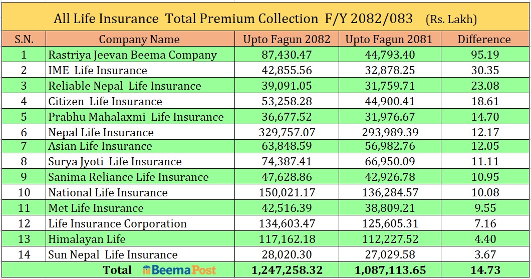 कुल बीमा शुल्क आर्जनको आधारमान नेपाल लाइफ इन्स्योरेन्स र नेशनल लाइफ इन्स्योरेन्स अग्रस्थानमा छन् भने बृद्धिदरका आधारमा सरकारी स्वामित्वको राष्ट्रिय जीवन बीमा, आइएमई लाइफ इन्स्योरेन्स अगाडि रहेका छन् ।