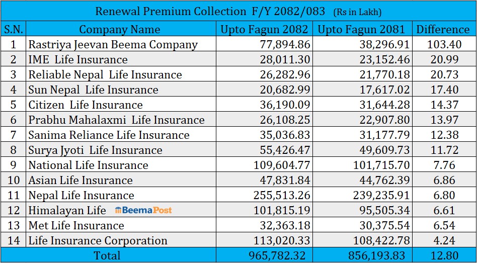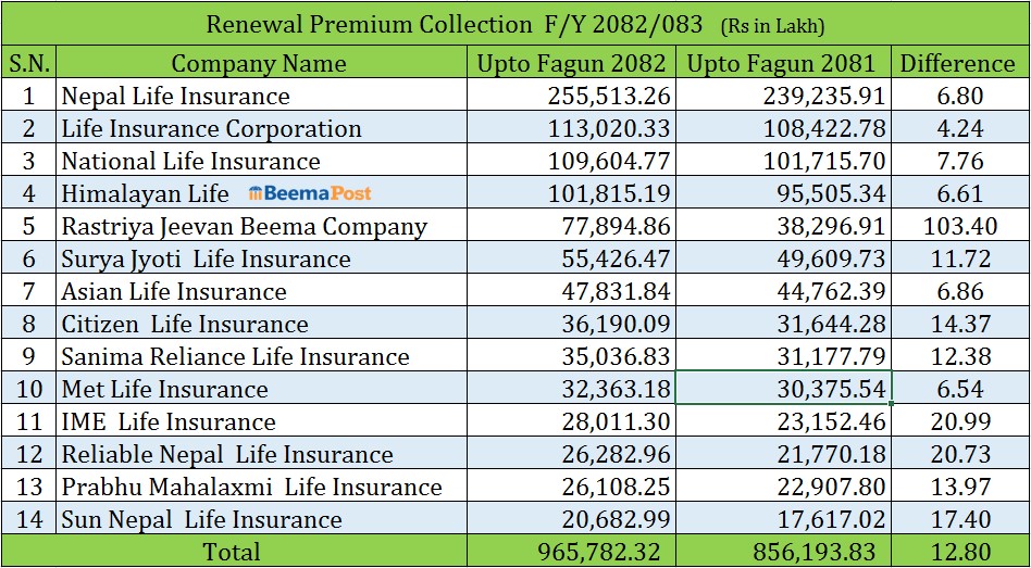 चालू आवको फागुन मसान्तसम्म सबैभन्दा धेरै नेपाल लाइफले २५ अर्ब ५५ करोड १३ लाख रुपैयाँ, एलआईसी नेपालले ११ अर्ब ३० करोड २० लाख रुपैयाँ, नेशनल लाइफले १० अर्ब ९६ करोड ४ लाख रुपैयाँ र हिमालयन लाइफले १० अर्ब १८ करोड १५ लाख रुपैयाँ नवीकरण बीमाशुल्क उठाएको छ।