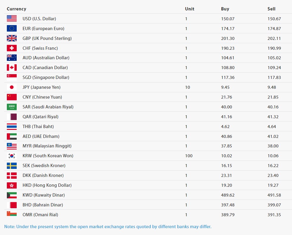 काठमाडौं । नेपाल राष्ट्र बैंकले आज चैत १२ गतेका लागि विदेशी मुद्राको विनिमयदर सार्वजनिक गरेको छ। जस अनुसार एक अमेरिकी डलरको खरीदमूल्य १५०.०७ रुपैयाँ र बिक्रीमूल्य १५०.६७ रुपैयाँ कायम भएको छ।