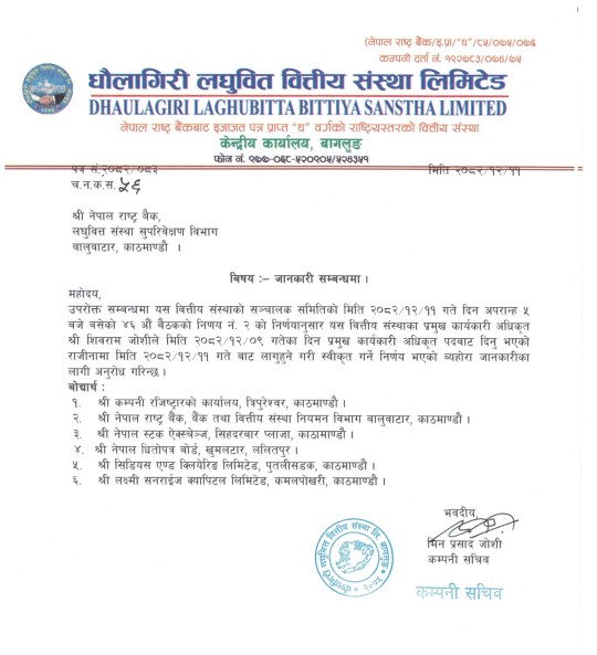 धौलागिरी लघुवित्तका सीईओ जोशीको राजिनामा स्वीकृत