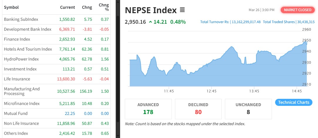 काठमाडौँ । साता कारोबारको अन्तिम दिन अर्थात बिहीबार शेयर बजार दोहोरो अंकले बृद्धि भएको छ । आज नेप्से परिसूचक १४.२१ अंकले बढेर २९५०.१६ को बिन्दुमा कायम भएको छ । शेयर बजारमा आज हाइड्रोपावर र बैंकिङ इन्डेक्समा हरियाली छाएको छ । बिहीबार विकास बैंक र लाइफ इन्स्योरेन्स इन्डेक्समा भारी गिरावट आएको छ ।