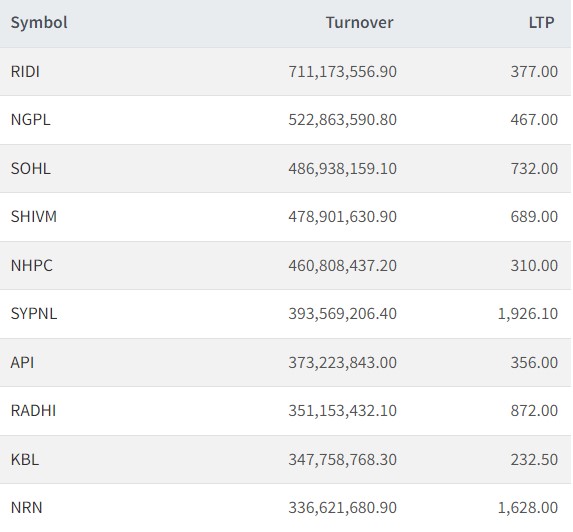 जसमध्ये सबैभन्दा धेरै रिडी पावरको ७१ करोड ११ लाख रुपैयाँ, ङादी ग्रुप पावरको ५२ करोड २८ लाख रुपैयाँ, सोलु हाइड्रोपावरको ४८ करोड ६९ लाख रुपैयाँ, शिवम सिमेन्टको ४७ करोड ८९ लाख रुपैयाँ र नेशनल हाइड्रोपावरको ४६ करोड ८ लाख रुपैयाँ बढीको शेयर किनबेच भएको छ।