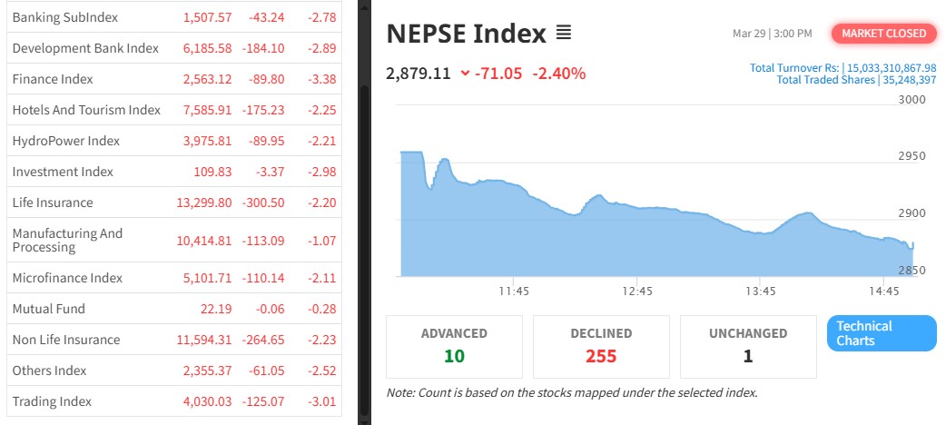 नेपाल स्टक एक्सचेञ्ज (नेप्से) ७१.०५ अकंले घटेर २८७९.११ बिन्दुमा कायम भएको छ । आज ३३३ कम्पनीको ३ करोड ५२ लाख ४८ हजार कित्ता शेयर किनबेच हुँदा १५ अर्ब ३ करोड ३३ लाख १० हजार रुपैयाँको कारोबार भएको हो ।