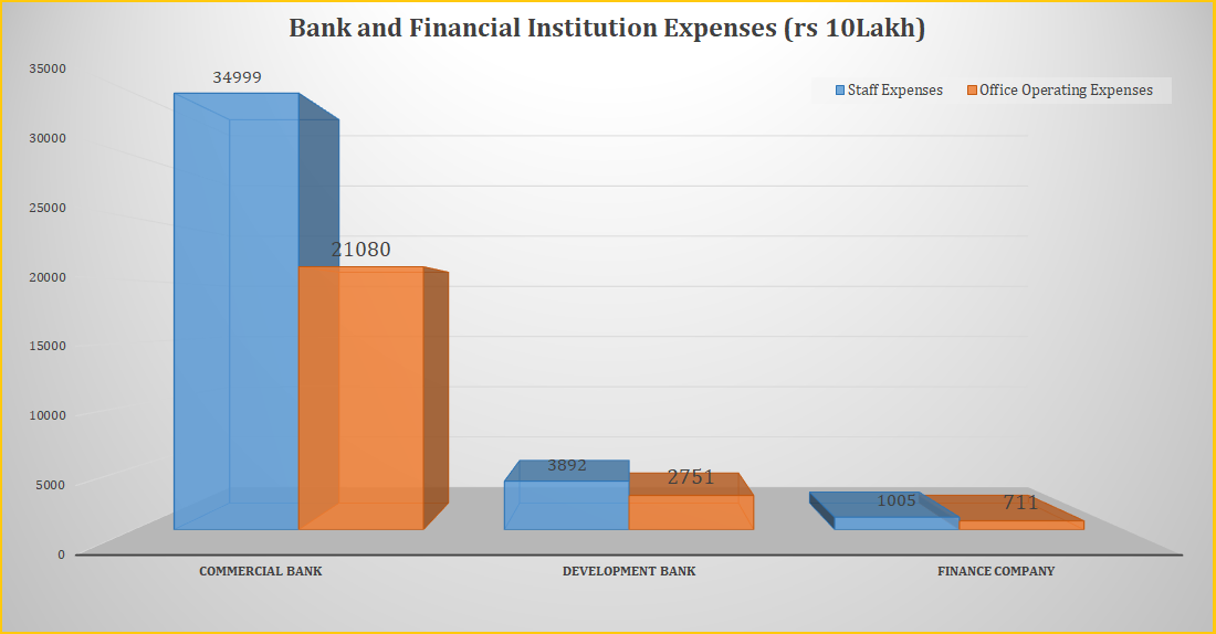 चालु आर्थिक वर्षको ८ महिनाको अवधिमा वाणिज्य बैंकको खर्च मात्रै ५६ अर्बभन्दा बढी रुपैयाँ रहेका छ । हाल सञ्चालनमा रहेका २० वटा वाणिज्य बैंकहरूले कर्मचारीको तलब भत्तामा ३४ अर्ब ९९ करोड ९० लाख र कार्यालय सञ्चालनको लागि २१ अर्ब ८ करोड रुपैयाँ गरी कुल ५६ अर्ब ७ करोड ९० लाख रुपैयाँ खर्च गरेका छन् । गत आर्थिक वर्षको सोही अवधिमा वाणिज्य बैंकहरूले कर्मचारी तलब भत्तामा ३३ अर्ब ३ करोड ७० लाख र कार्यालय सञ्चालनको लागि २१ अर्ब २१ करोड गरी कुल ५४ अर्ब २४ करोड रुपैयाँ खर्च गरेका थिए ।