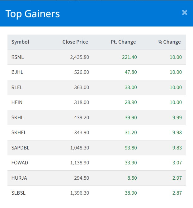 यस दिन रिलायन्स स्पिनिङ्ग मिल्स, भुजुङ हाइड्रोपावर, रिज लाइन इनर्जी र होटल फरेष्ट इनको शेयरमूल्य १० प्रतिशतले वृद्धि भएको छ भने सुपर खुदी हाइड्रोपावरको ९.९९ प्रतिशत र सूर्यकुण्ड हाइड्रो इलेक्ट्रिकको ९.९८ प्रतिशतले बढेको छ।