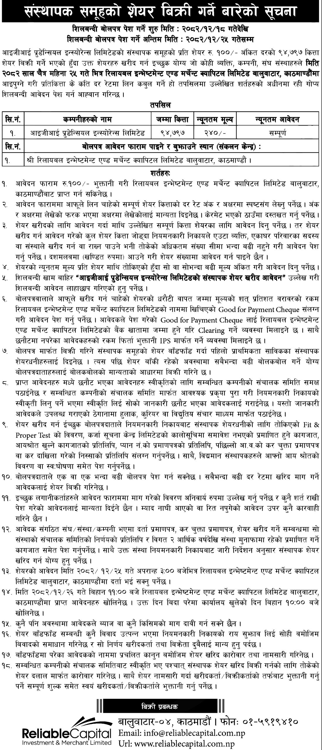 यस्तो बोलपत्र काठमाडौंको बालुवाटारस्थित रिलायबल इन्भेष्टमेन्ट एण्ड मर्चेन्ट क्यापिटल लिमिटेडबाट प्राप्त गर्न र बुझाउन सकिनेछ। बोलपत्र आज चैत १८ गतेदेखि चैत २५ गतेभित्र पेश गरिसक्नु पर्नेछ।