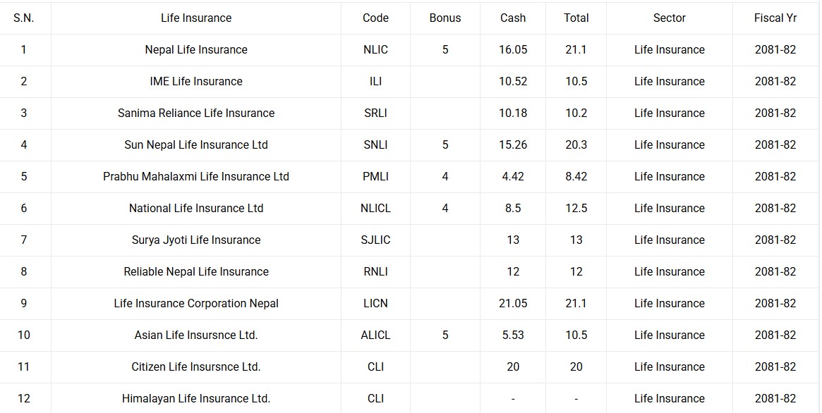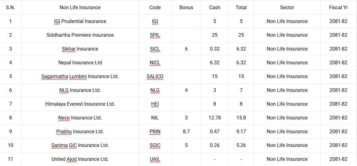 यता सगरमाथा लुम्बिनीले १५ प्रतिशत नगद लाभांश र प्रभु इन्स्योरेन्सले ८.७ प्रतिशत बोनस र ०.४७ प्रतिशत नगद गरी कुल ९.१७ प्रतिशत लाभांश दिने भएका छन्। हिमालय एभरेष्ट र शिखर इन्स्योरेन्सले पनि क्रमशः ८ र ६.३२ प्रतिशत लाभांशको घोषणा गरेका छन्। निर्जीवन बीमा कम्पनीतर्फ शिखर, एनएलजी, नेको, प्रभु र सानिमा जीआईसीले मात्रै बोनस शेयर दिएका छन् ।