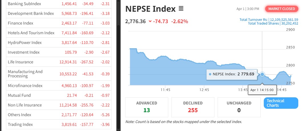यसदिन वाणिज्य बैंक समूहको २.३१ प्रतिशत, विकास बैंक समूहको ३.१८ प्रतिशत, फाइनान्स समूहको ३.०३ प्रतिशत, होटल तथा पर्यटन समूहको २.१२ प्रतिशतले शेयर मूल्य घटेको छ । १३ वटै उपसूचक राताम्य देखिएको हो ।