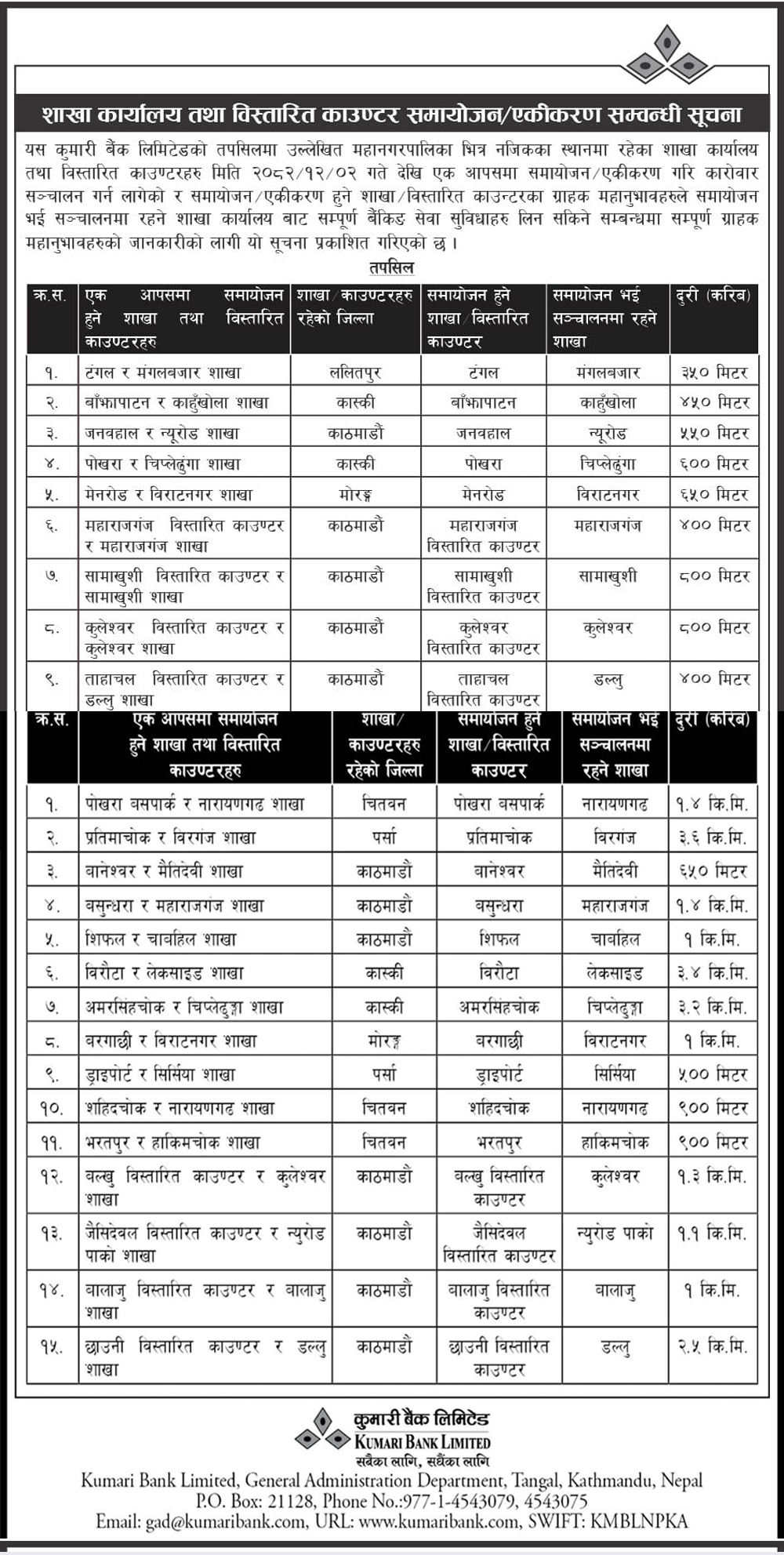 बैंकले दिएको जानकारीअनुसार काठमाडौं महानगरपालिकाभित्र रहेका महाराजगन्ज, सामाखुशी, कुलेश्वर र ताहाचलका विस्तारित काउन्टरहरू सम्बन्धित शाखामा गाभिएका छन् भने जनवहाल शाखा न्यूरोड शाखामा समायोजन गरिएको छ। यससँगै बानेश्वर शाखा मैतीदेवी शाखामा, बसुन्धारा शाखा महाराजगन्ज शाखामा र सिफल शाखा चाबहिल शाखामा मर्ज गरी सेवा सुचारु गरिएको छ।