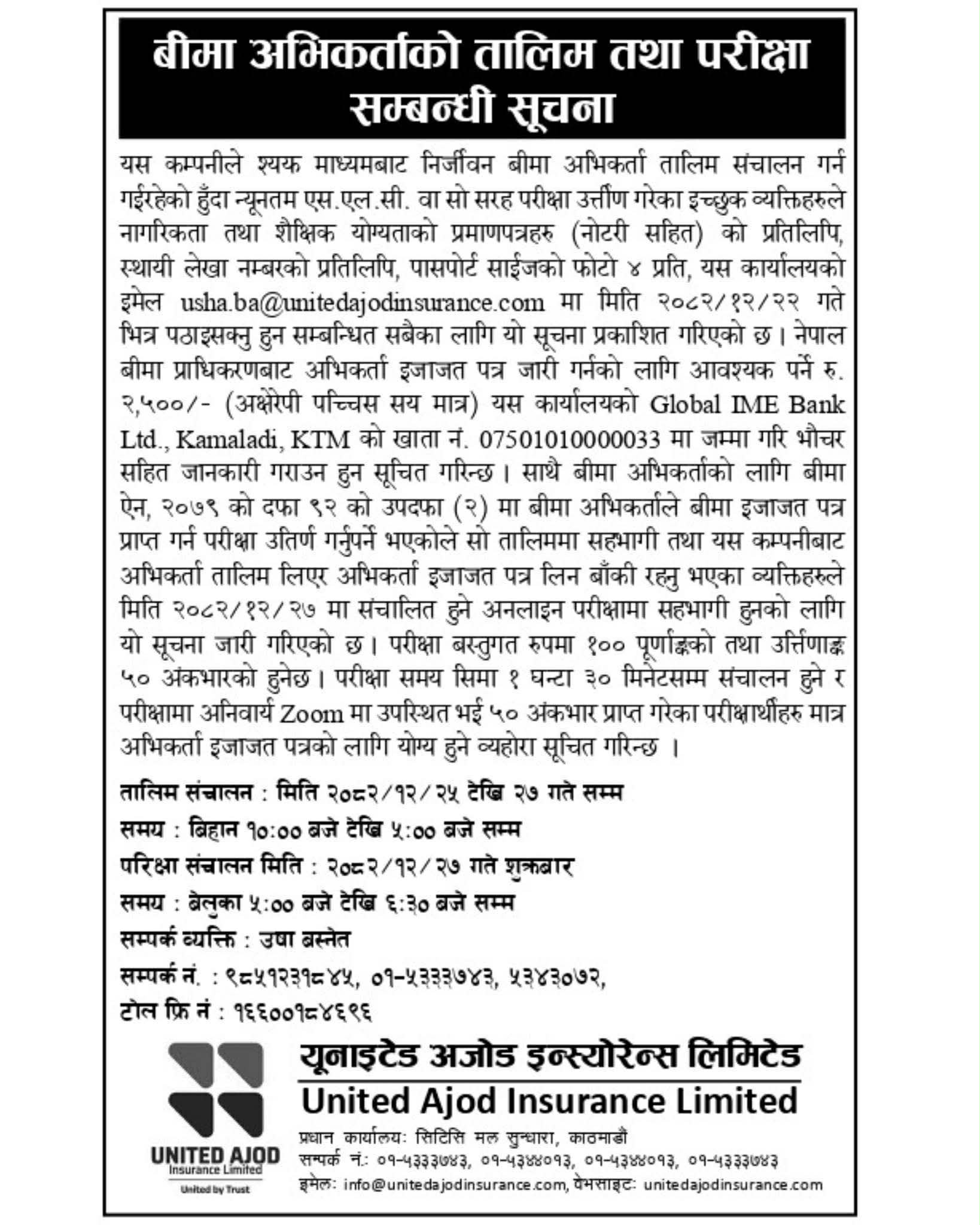 यूनाइटेड अजोड इन्स्योरेन्सले सञ्चालन गर्दै अभिकर्ता तालिम, परीक्षा चैत २७ गते
