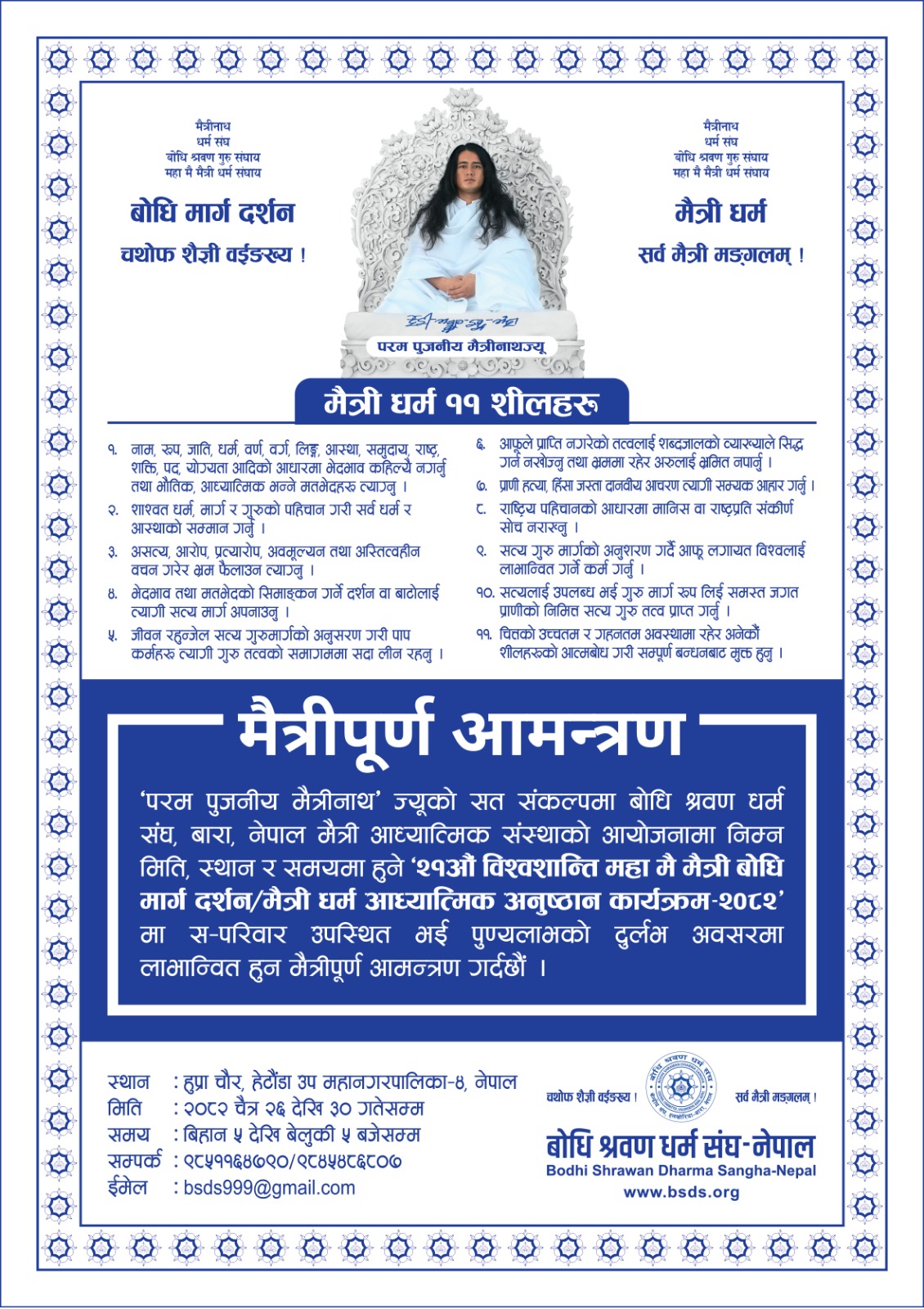 कार्यक्रममा मैत्री धर्मका ११ शीलसमेत प्रस्तुत गरिनेछ, जसमा कुनै पनि आधारमा भेदभाव नगर्ने, सबै धर्म र आस्थाको सम्मान गर्ने, असत्य र भ्रम फैलाउने कार्य त्याग्ने, हिंसाबाट टाढा रहने, सकारात्मक सोच र सेवा भाव अपनाउने लगायतका विषय समेटिएका छन्।